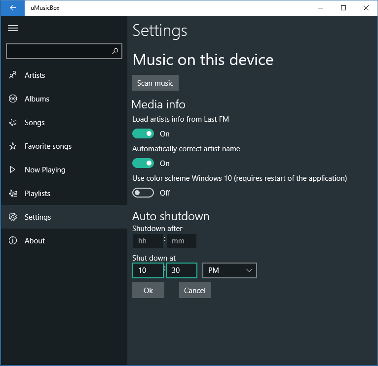 Play music stored on the device in format .mp3, .aac, .m4a, .wma, .mp2 and .flac.Manage your collection of music.Create and edit playlists of your favorite songs. Picture and bio upload of the artist from last.fm.Upload and set your pictures for playlists, artists and albums.Set up timer to shut down the app: at a particular time or after a specified amount of time.