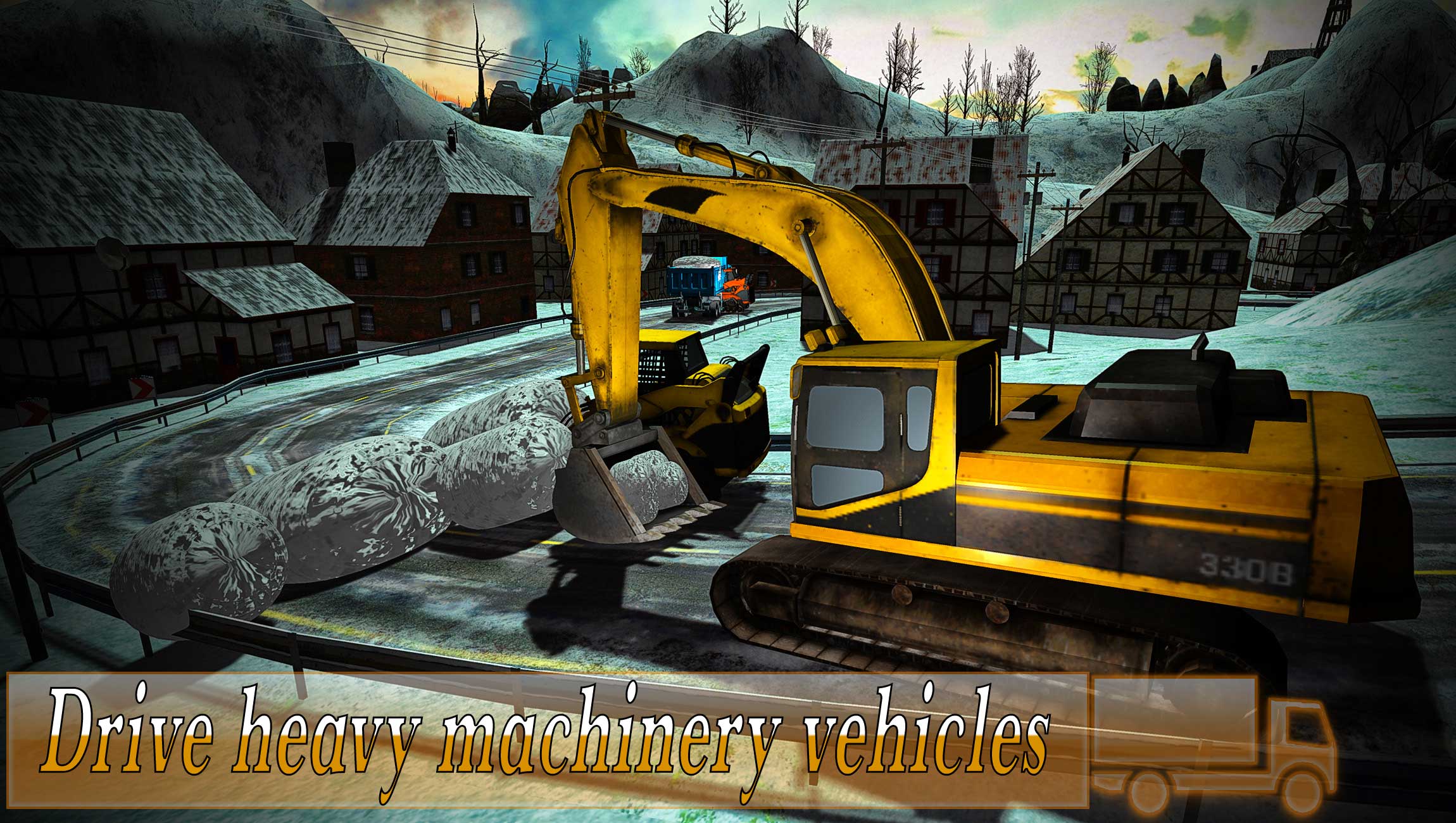 Heavy Snow Excavator Crane Op is equipped with amazing 3D visuals, engaging sound-effects, making you feel like a heavy machinery excavator operator, a snow plow and a dump truck driver, giving you the thrill of being a hero and rescuing people trapped due to snow-sliding in the mountain! Enjoy the chilly environment, with snow flakes falling and a blizzard brewing up as you carry out your rescue operation!