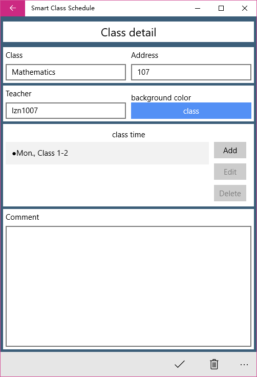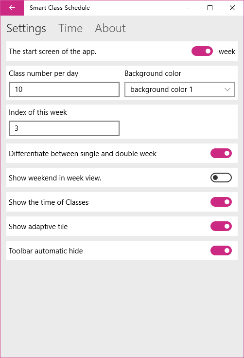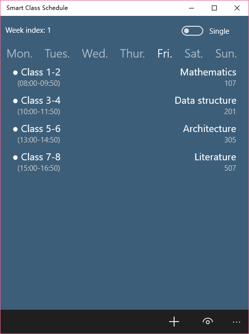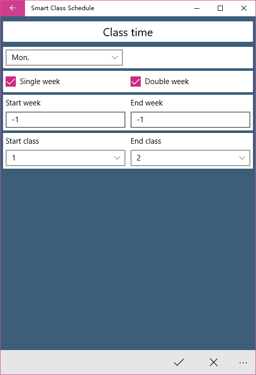 Modified the screen of class list. Added the function of class week. Corrected the bug of settings. Corrected the bug of switch single and double week.