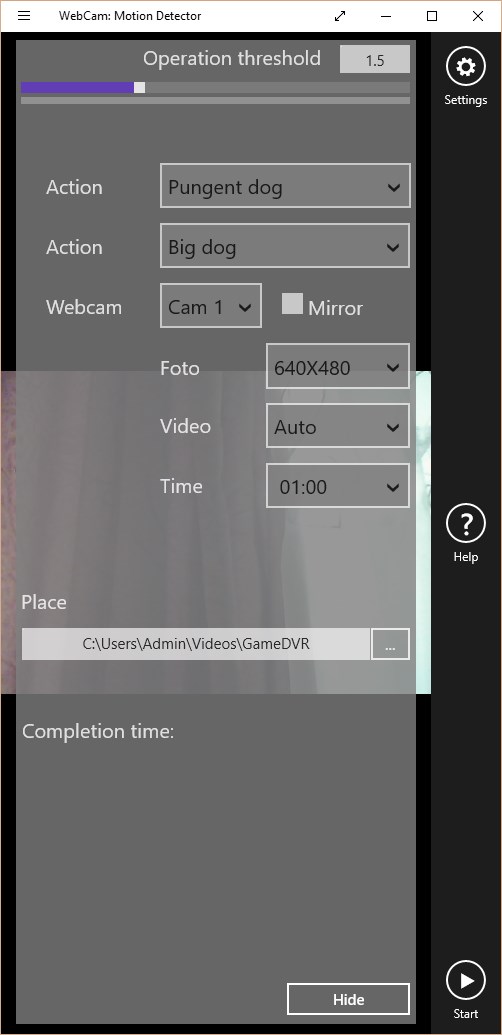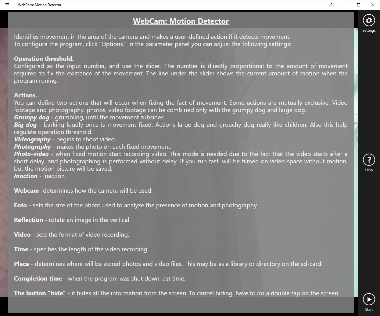 Motion detector - can detect the movement using one of the webcams of the device. When a motion detector senses movement, it can simultaneously perform up to three user-defined actions.