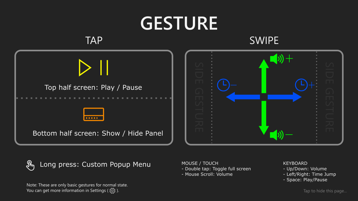 Touch Gesture Time/VolumeTwo finger Scale, Move HARDWARE DECODING!Sound effectUWP for all windows platformsBrightness, Contrast, Saturation, Hue Adjusting.
