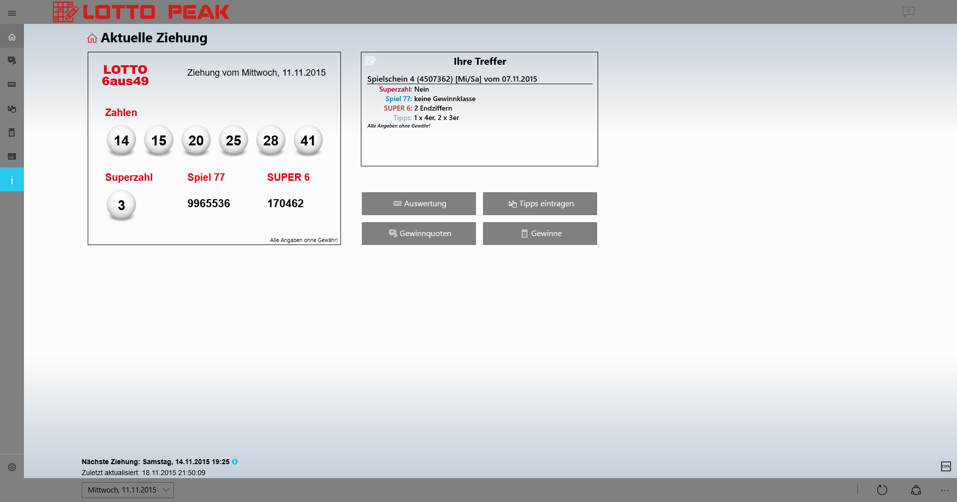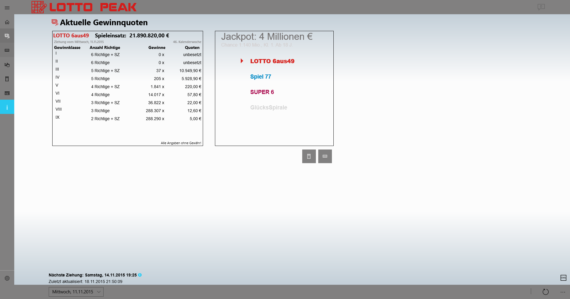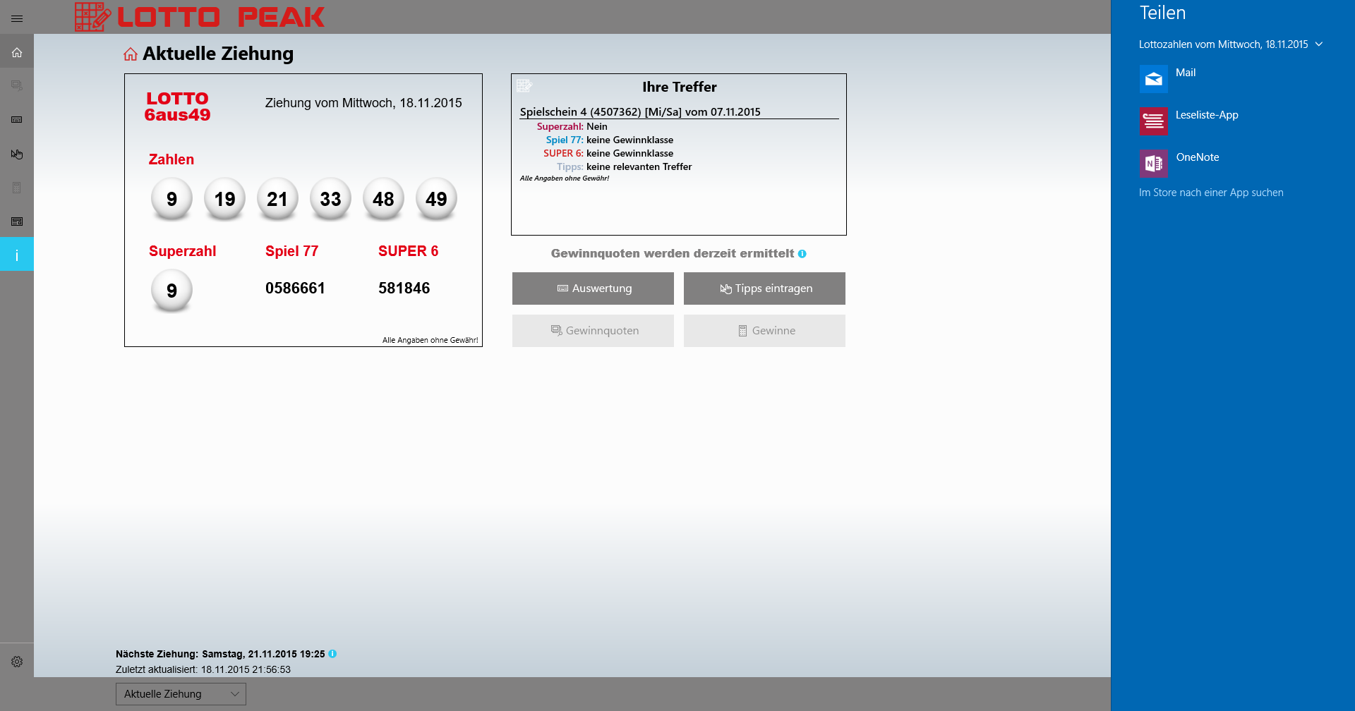 Display the current lottery numbers (6aus49, Spiel77, Super6), as well as the associated oddsNotifications about current lottery numbers and oddsLive tile with current draw data in four sizesLock screen notificationSharePrintCost/profit Protocol