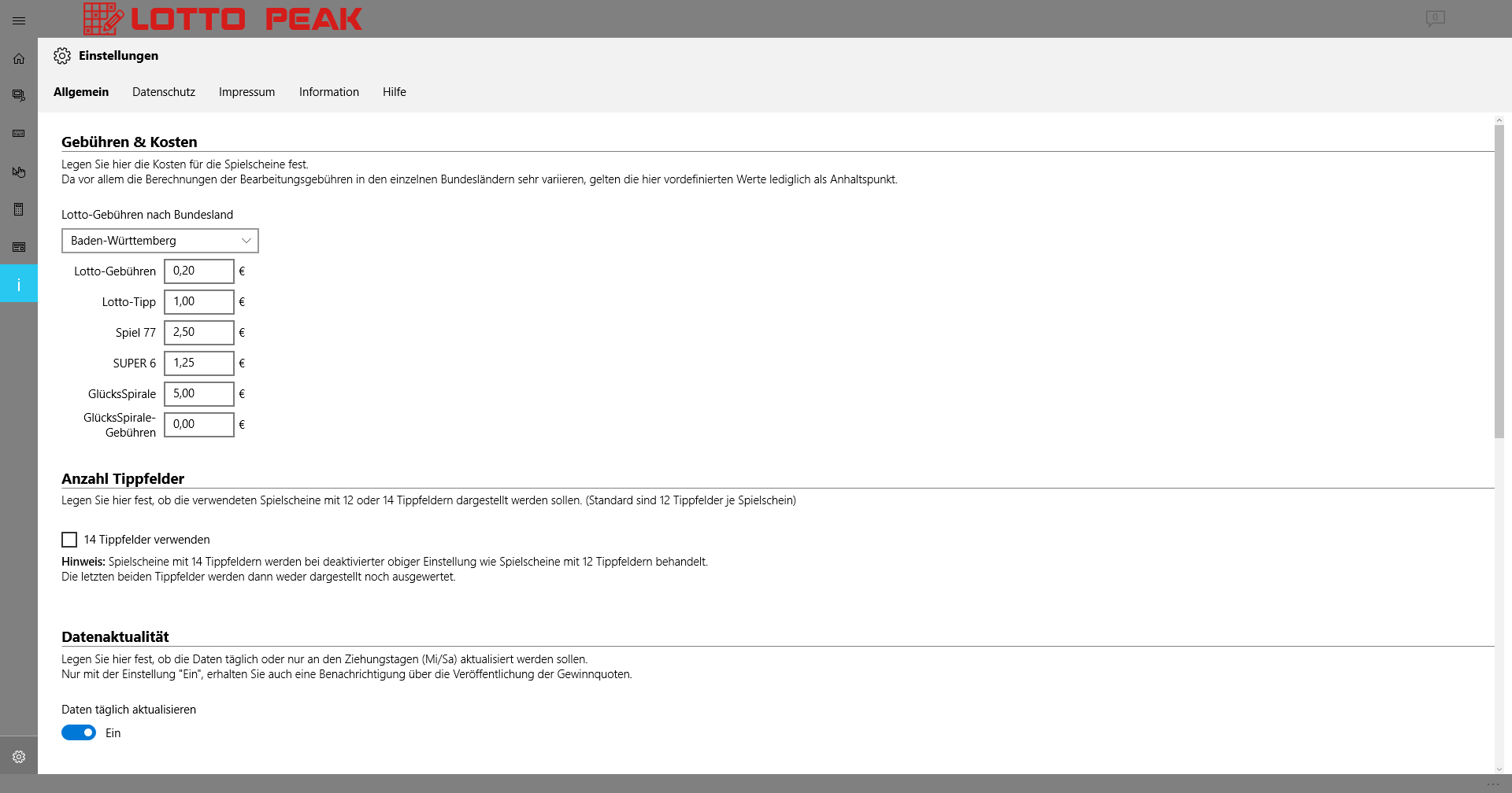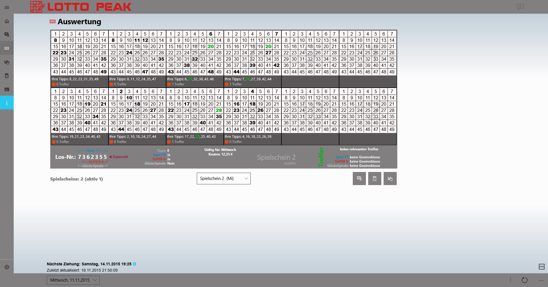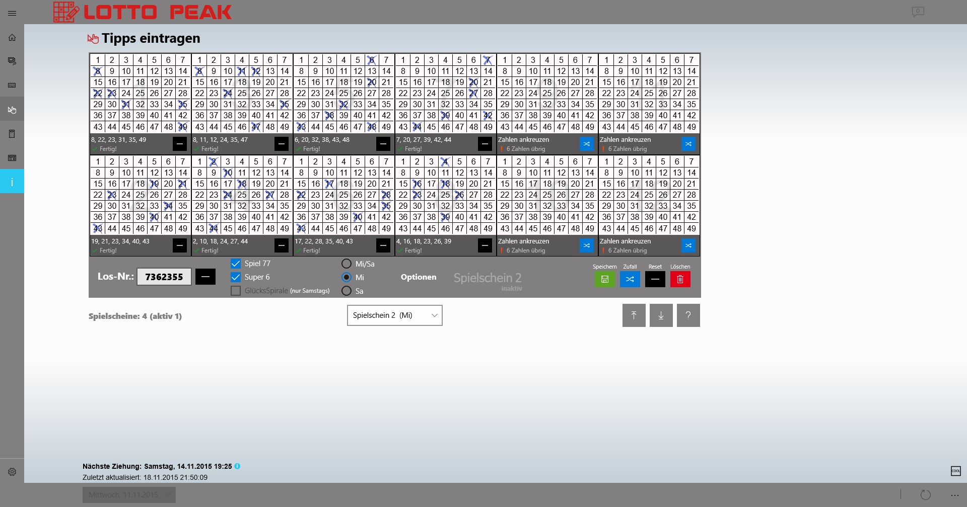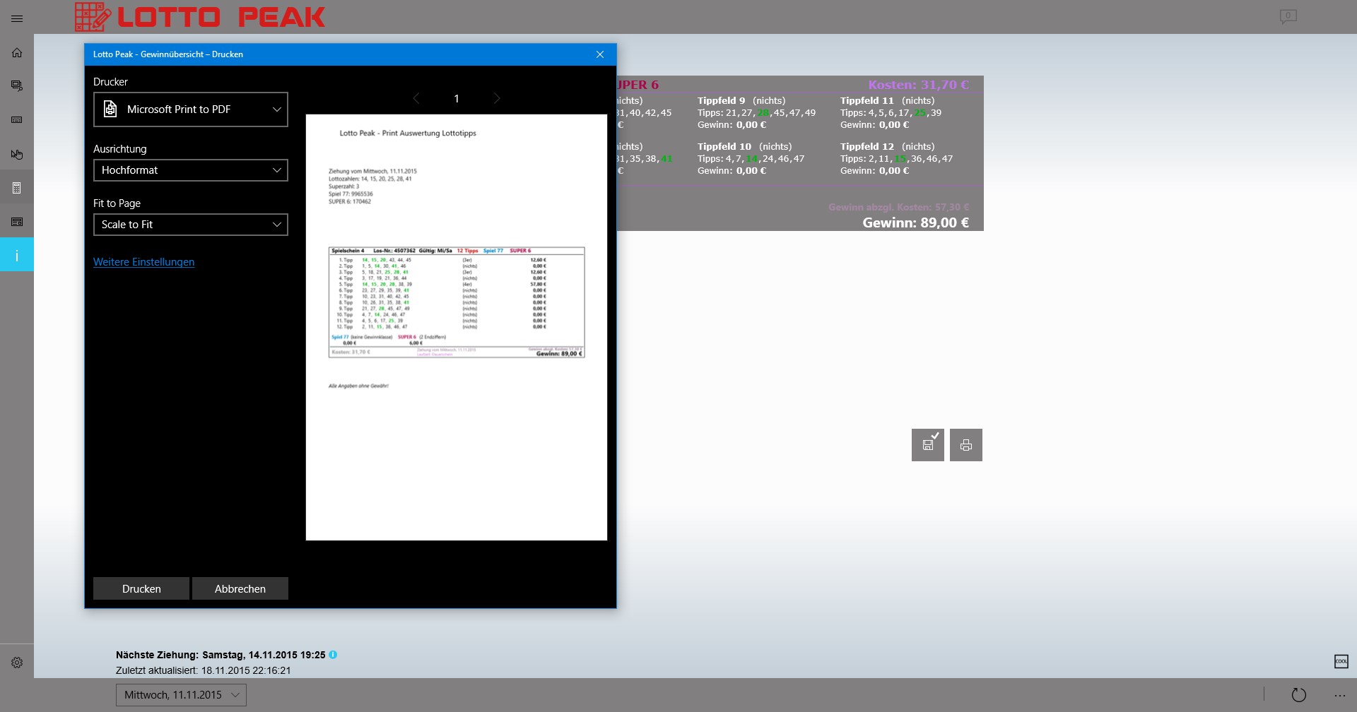 Display the current lottery numbers (6aus49, Spiel77, Super6), as well as the associated oddsNotifications about current lottery numbers and oddsLive tile with current draw data in four sizesLock screen notificationSharePrintCost/profit Protocol