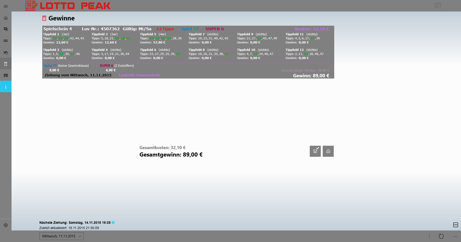 The Lotto Peak app not only promptly indicates the latest winning lottery numbers, but can match the lottery data with your own tips and show any profits.