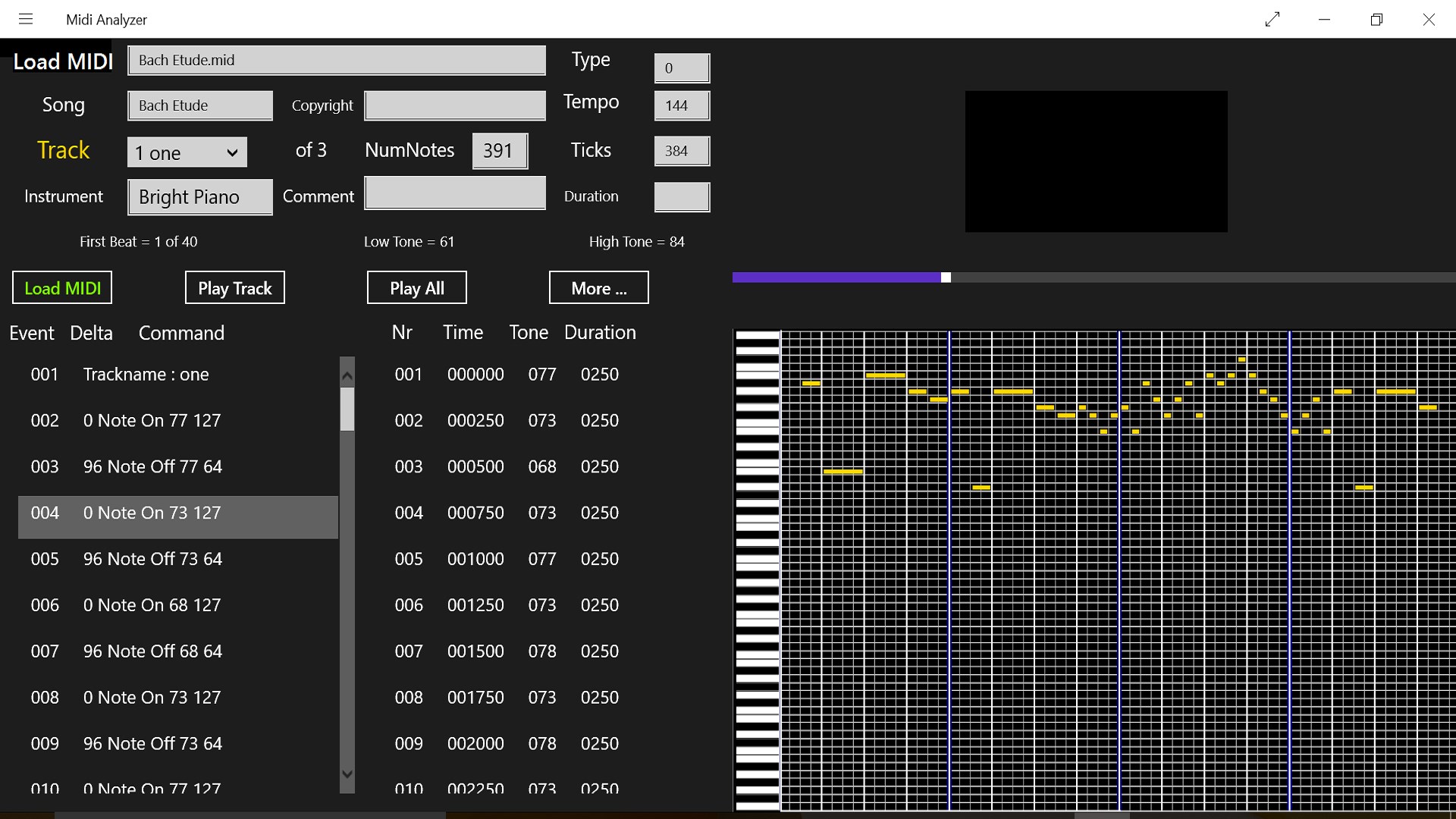 The MIDI Analyzer lets you inspect MIDI files and see the commands, comments and data. You can also selective play each single track.