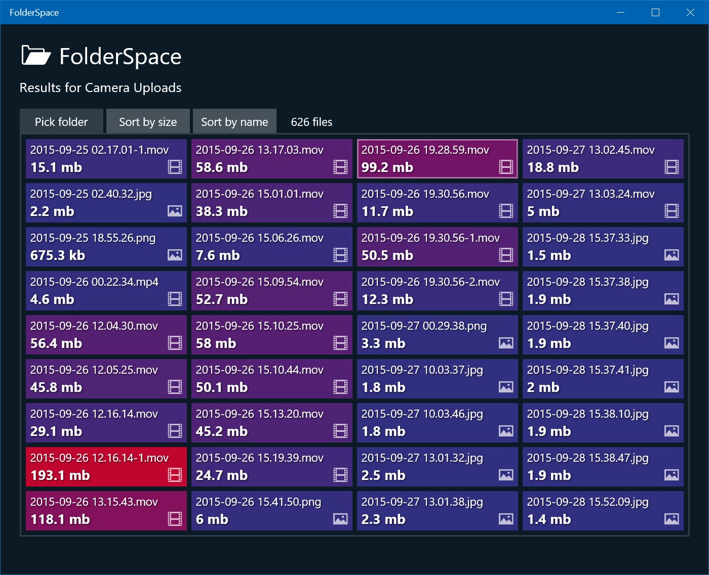 FolderSpace aims to be efficient. On a Microsoft Surface Pro 3, FolderSpace can scan around 5,000 files per minute -- making it fantastic for cleaning out things like your OneDrive, Dropbox, Documents folder, Downloads folder, and Videos folder.
