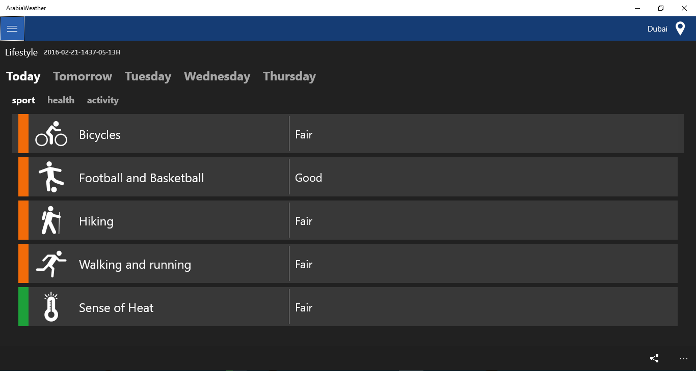 Daily and hour by hour weather forecastGet notifications in case of severe weather conditions or when the weather condition changesKnow all weather-related lifestyle activities, such as sports, health and more
