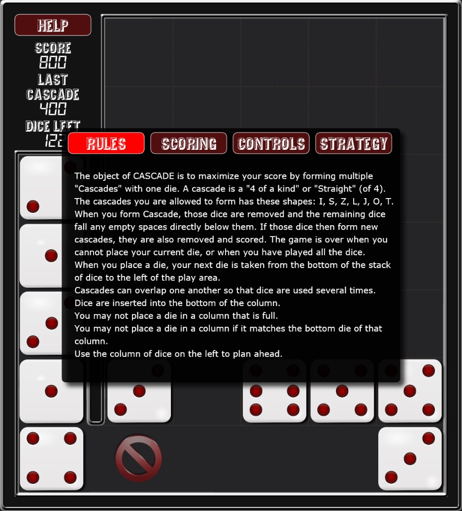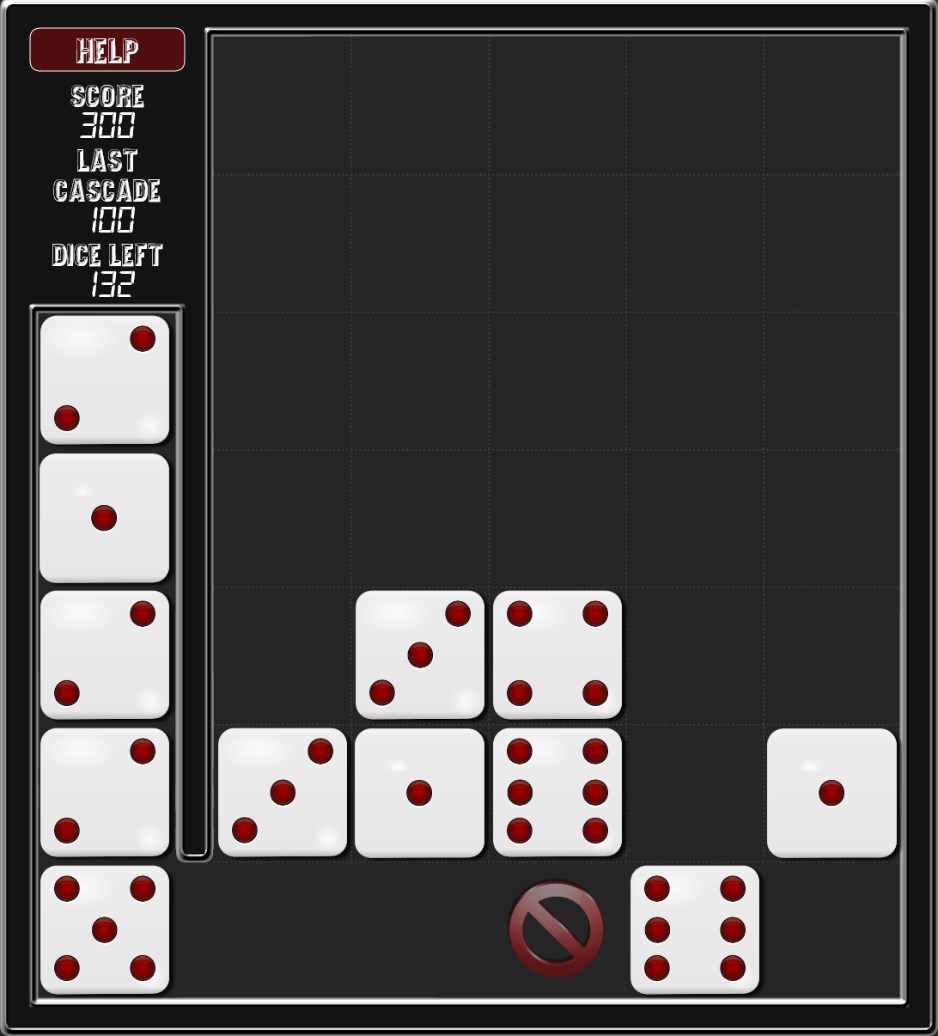 Real Cascade is fun and really easy to play. Use the dice to form cascades (patterns) on the board to gather points and free space. You have 150 dice and no time limit. Carefully choose where to insert the next die. Use the column of dice on the left to plan ahead.