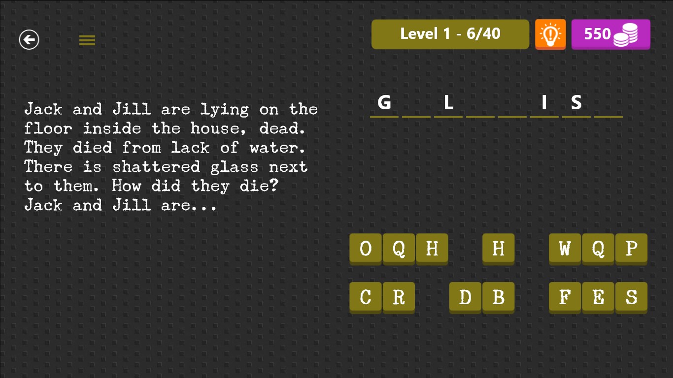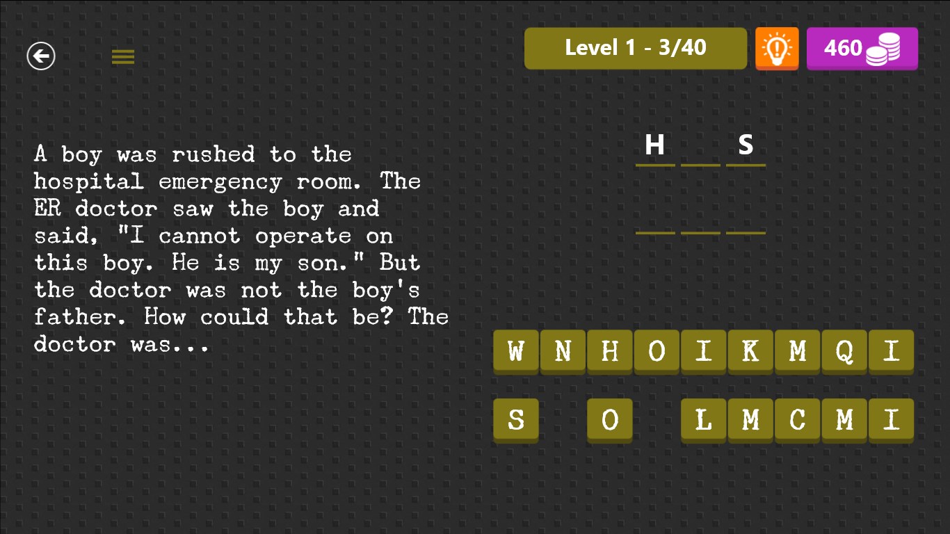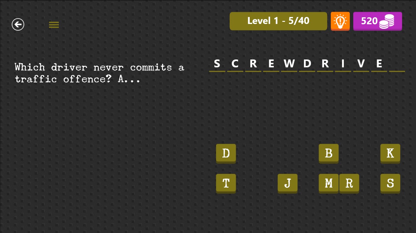 200 riddles to solveSupports both Windows and Windows PhonePleasing in-game animationNo registration, just play!