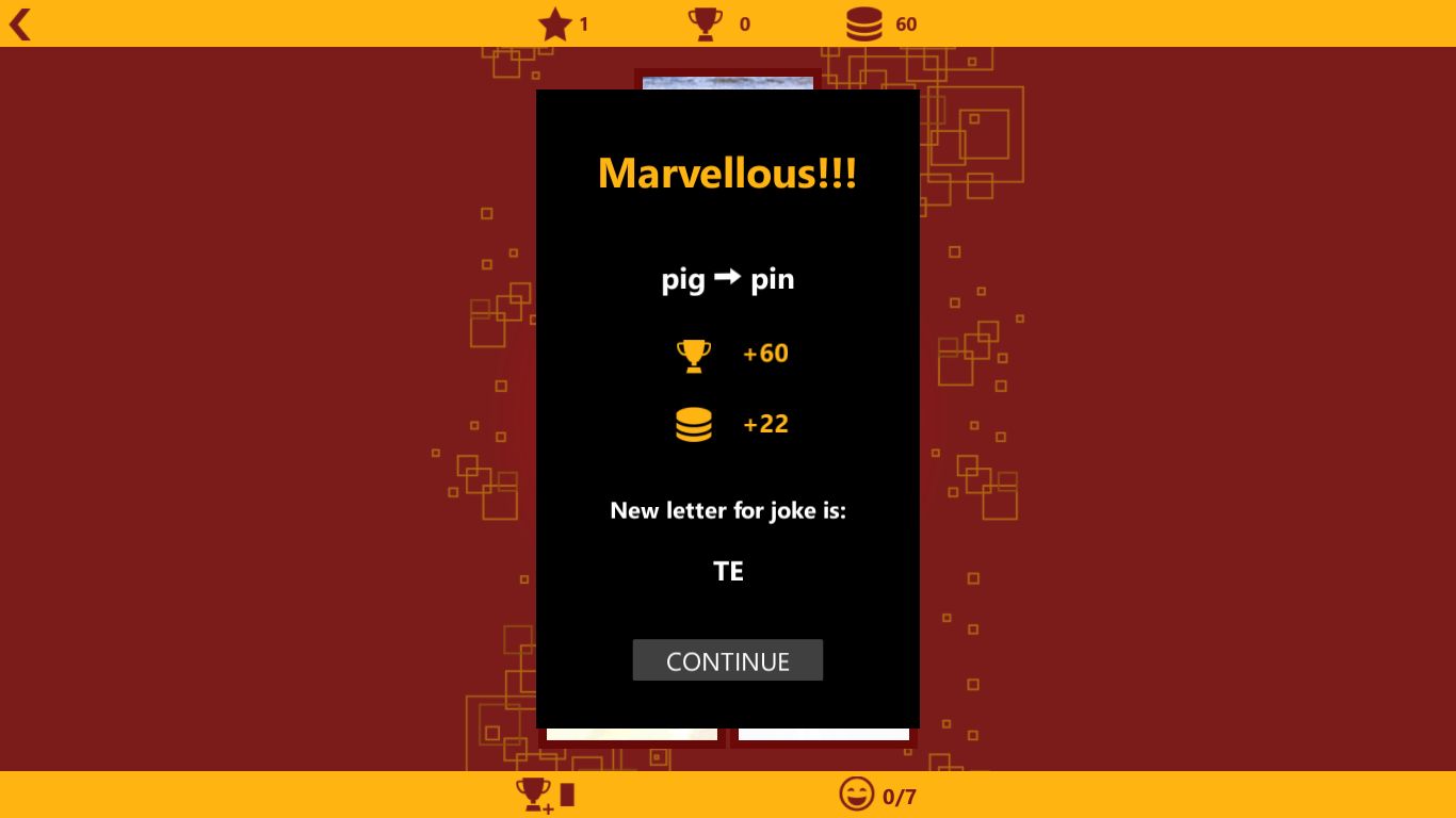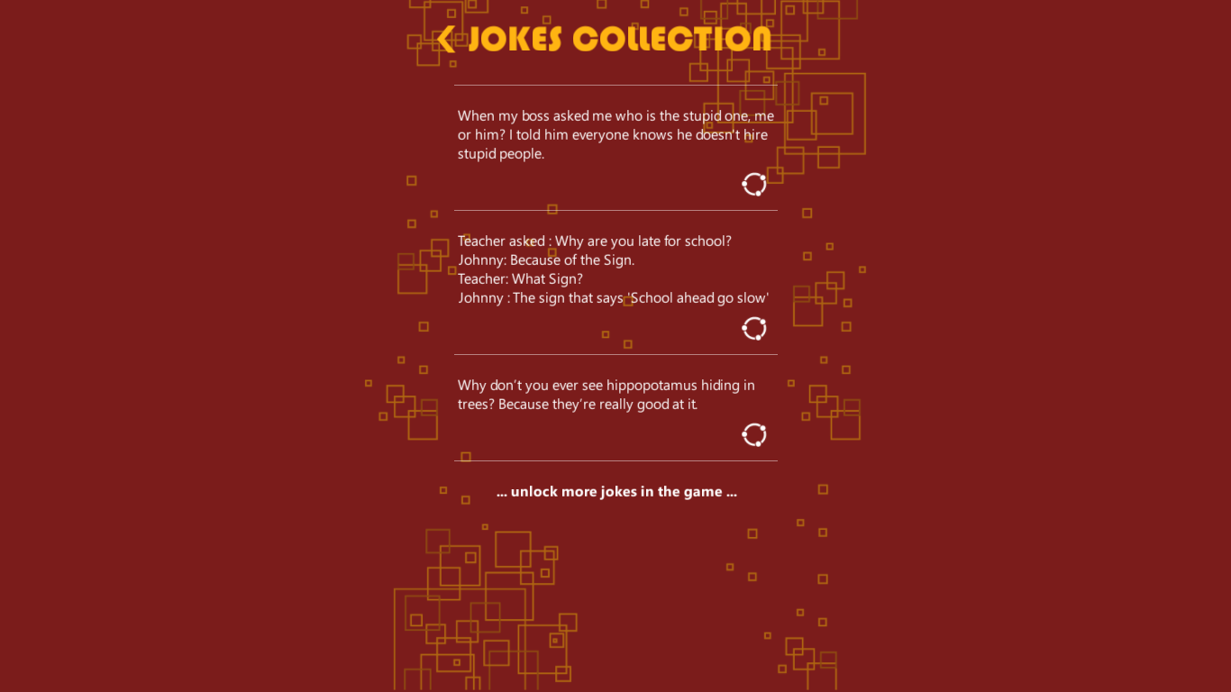 For each completed level you obtain the letters for a joke. When you have all required letters joke is added to your jokes collection and you can share it with your friends:)