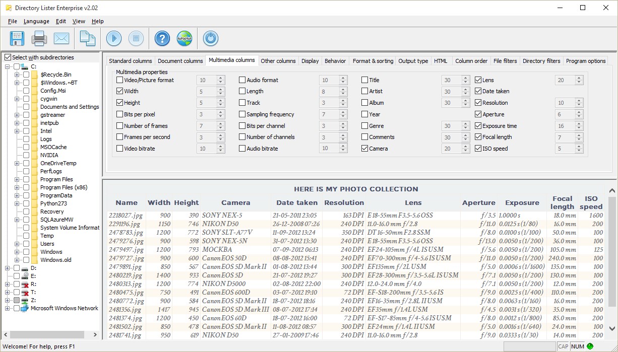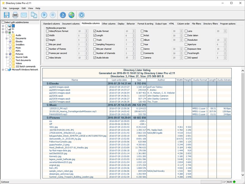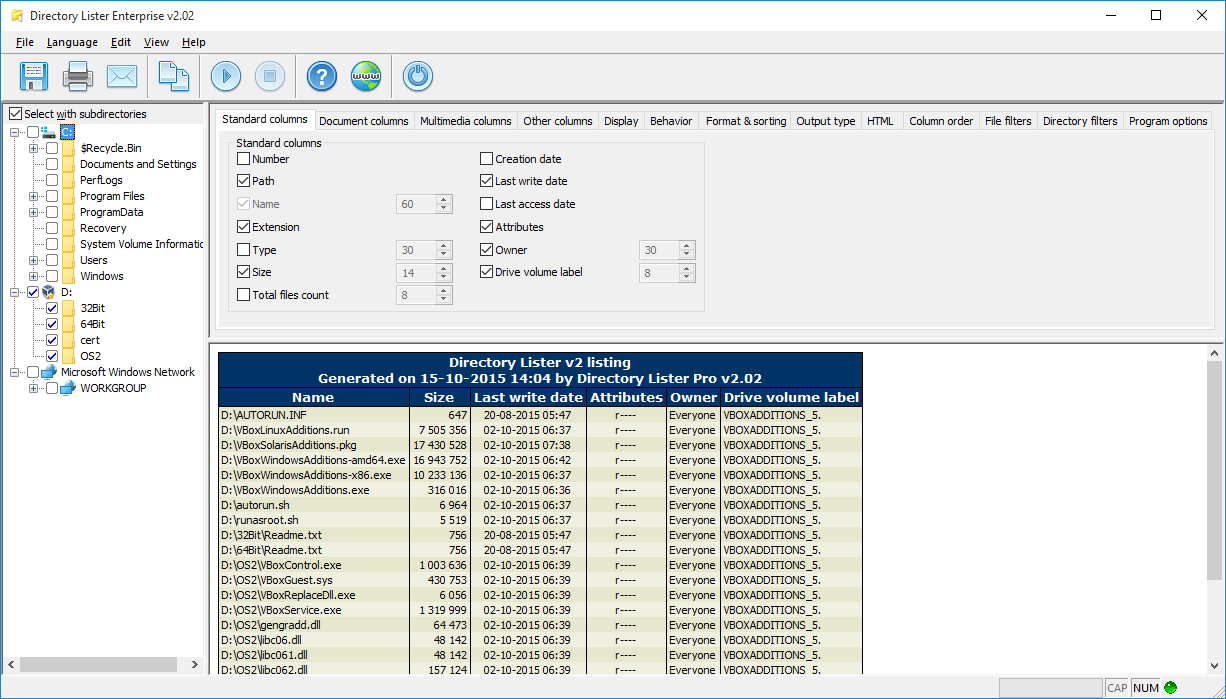 Directory Lister allows you to create, save, print, send via e-mail or store to database listings of files from selected directories on hard disks, CDs, DVDs, USB storages and network shares. Listing can be in HTML or text format.