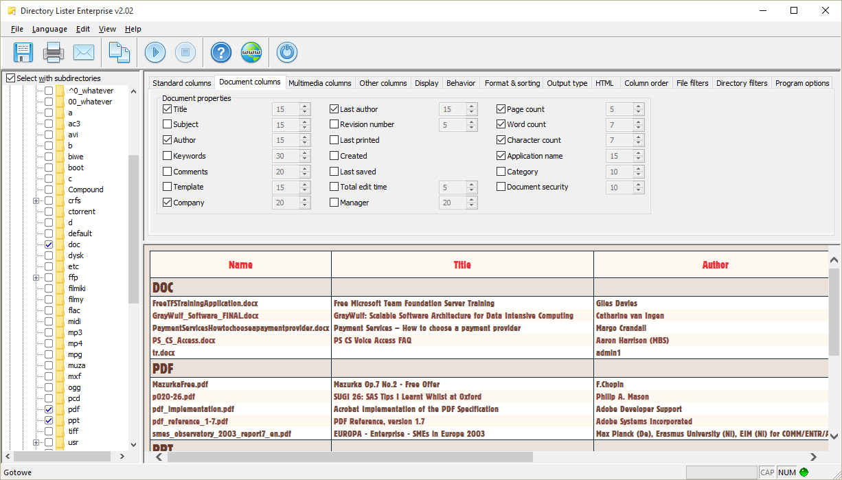 Another set of columns you can print is for Microsoft Office files (DOC, DOCX, XLS, XLSX, PPT, PPTX) so you can see document title, author, keywords etc. without opening these files one after another.
