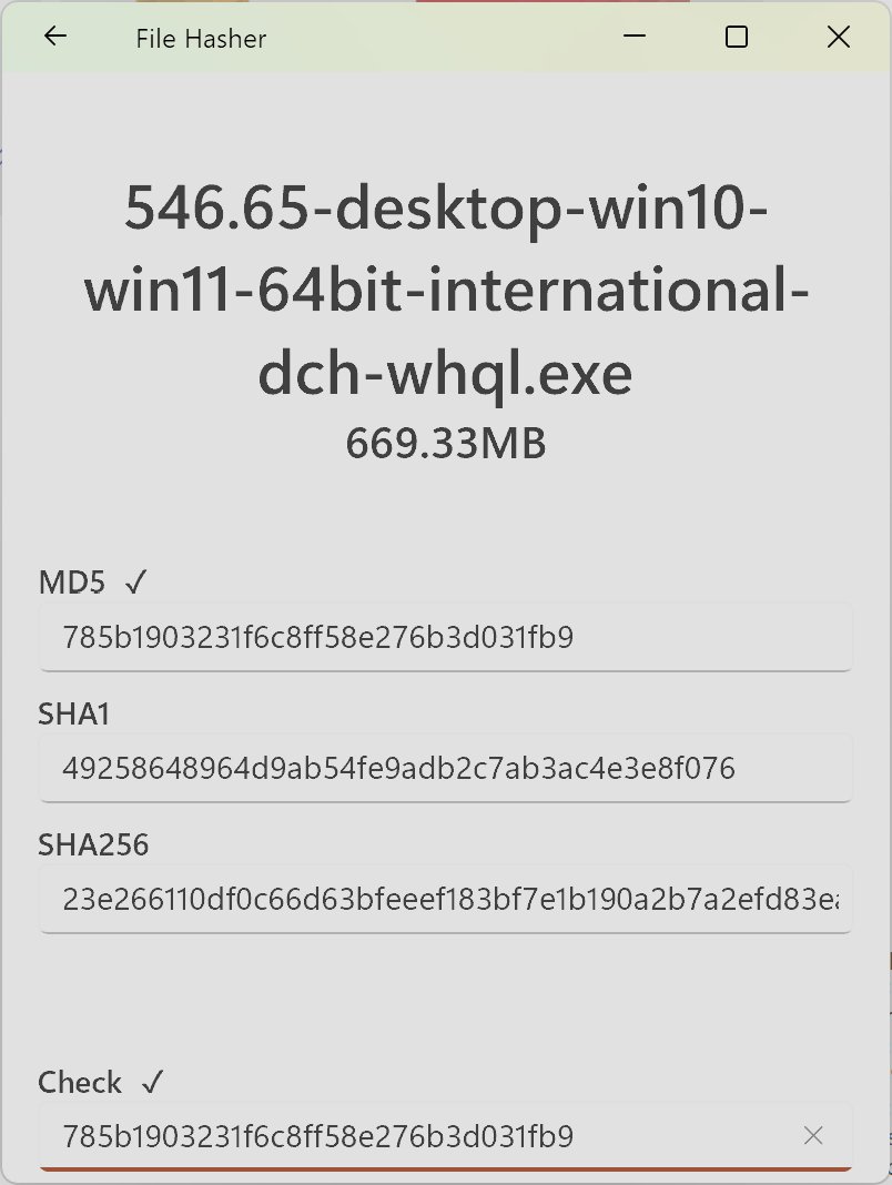 Computes a file\'s MD5, SHA1 and SHA256Whitespace or separators are ignored when verifying hash matchesOpen files via drag and drop from file explorer