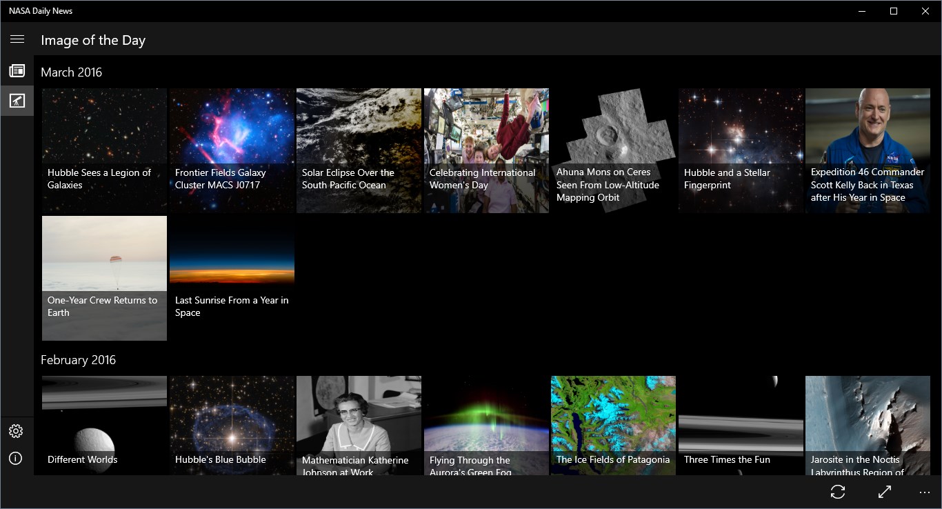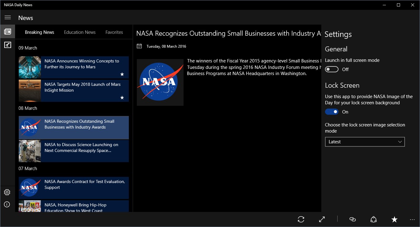 Read the latest NASA news headlines and summariesBrowse through the stunning high resolution images from the Image of the Day galleryShare articles with your social networksSave image from the Image of the Day gallery to your deviceLock Screen & Live Tile can cycle through Latest or Random NASA Image of the DayCreate a list of your Favorite NASA articles that syncs across all your Windows DevicesOptimized for Phone, PC, & Tablet