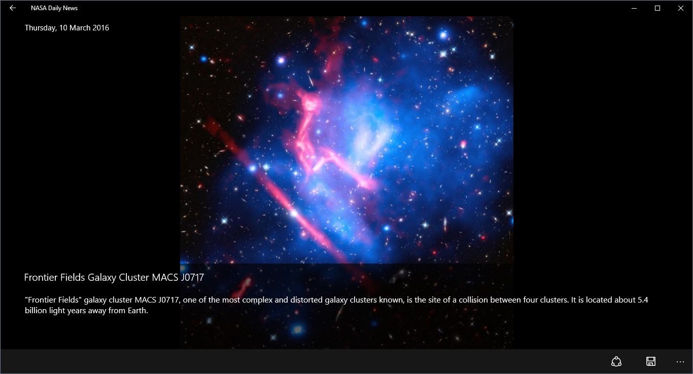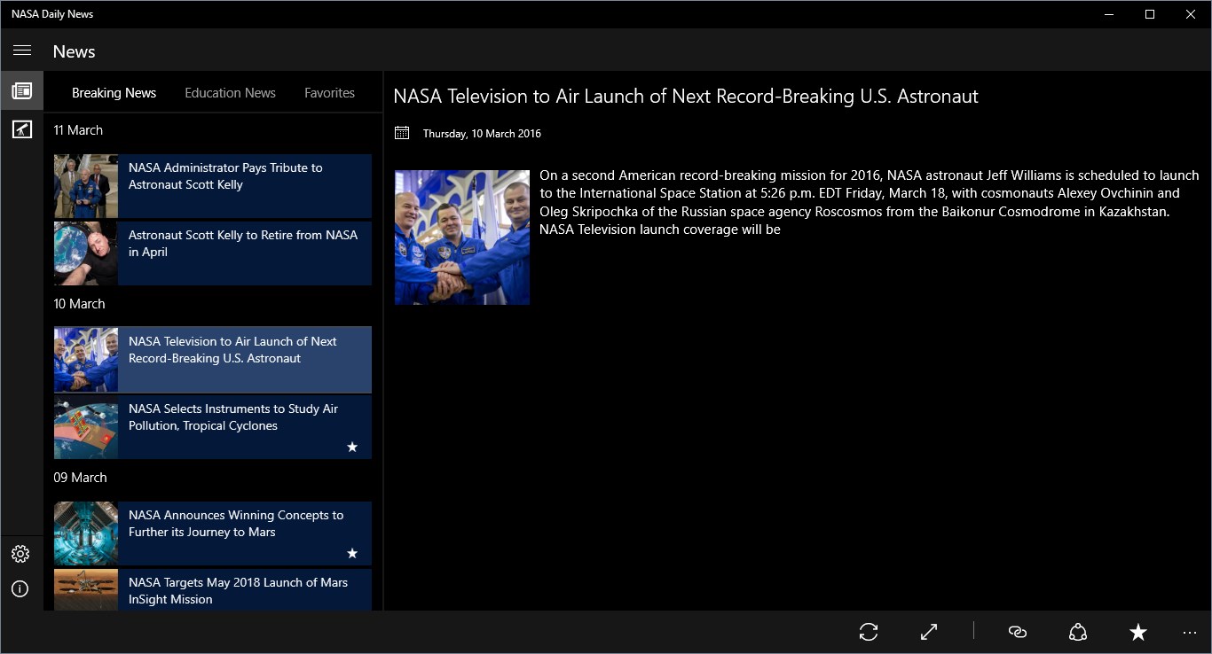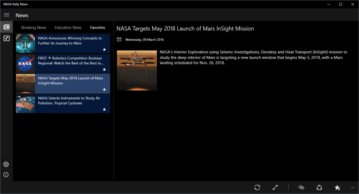 Read the latest NASA news headlines and summaries or switch to full screen mode and browse through the captivating NASA Image of the Day gallery. Favorites list makes it easy to save your favorite NASA articles and access them from any of your Windows Devices. It is a perfect app for anyone interested in astronomy.
