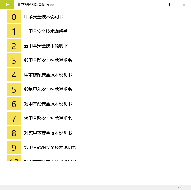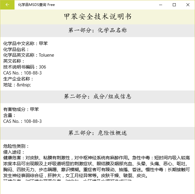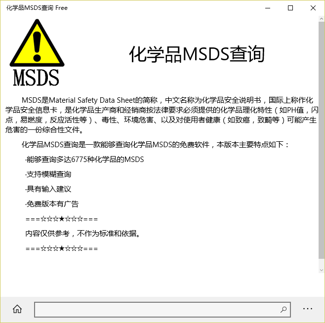 化学品MSDS查询是一款能够查询化学品MSDS的免费软件,本版本主要特点如下: