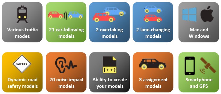 Various traffic modes21 car-following models2 overtaking models2 lane-changing modelsMac and WindowsDynamic road safety models20 noise impact models Ability to create your models3 assignment models Smartphone and GNSSVISSIM import/export