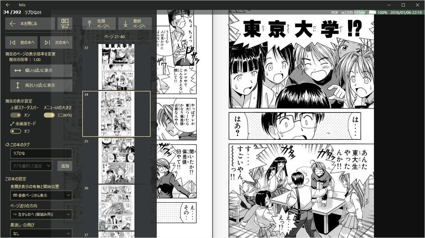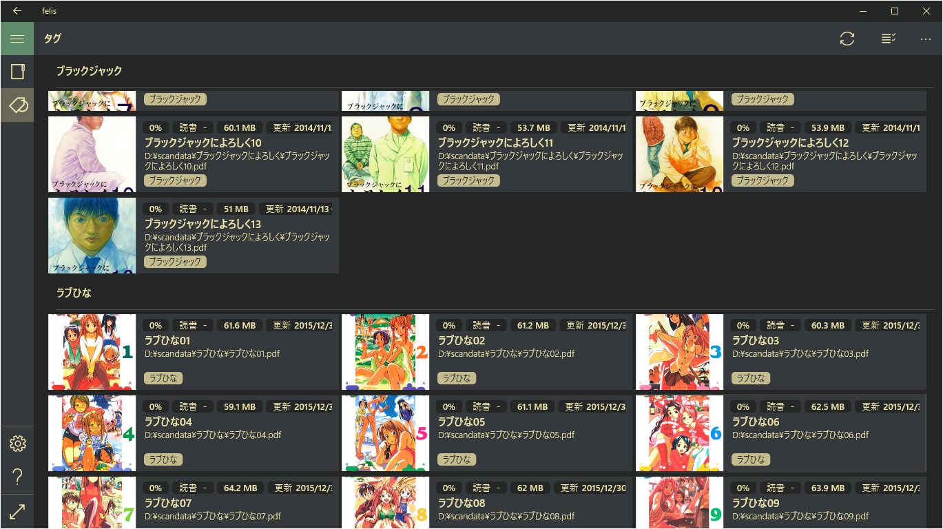 PDF ファイルを読みやすく表示ZIP / RAR ファイル内の JPG / PNG / BMP 画像ファイルを読みやすく表示ピンチイン・ピンチアウトで自然なズーム画像拡大時も「ステップスクロール」機能で簡単なページ送りアプリ内のファイルブラウザ機能で簡単なファイルアクセスファイルにタグを設定して自由なライブラリ管理UWPアプリだから Windows 10 デスクトップPC も ノートPC も タブレット も モバイルデバイス も使える画像ファイルビューアーとしても使える