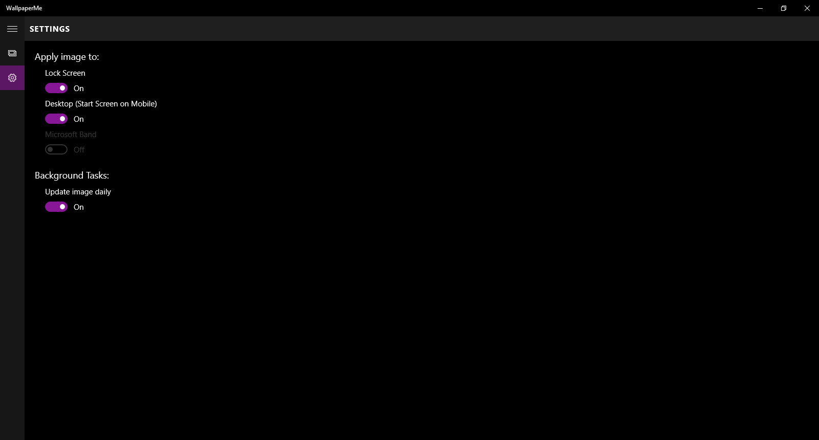 Allows you to set the Bing Image of the Day (specific to your device's region) to be your Lockscreen, Desktop (Start background for Mobile), and/or Microsoft Band MeTile Image. You can also choose whether or not the image is updated daily. All options are OFF by default. You must run the app at least once and turn on what you want. Due to sizing restrictions on the Microsoft Band the image will be automatically cropped to strip from the center of the image, a preview is available in the Settings page.