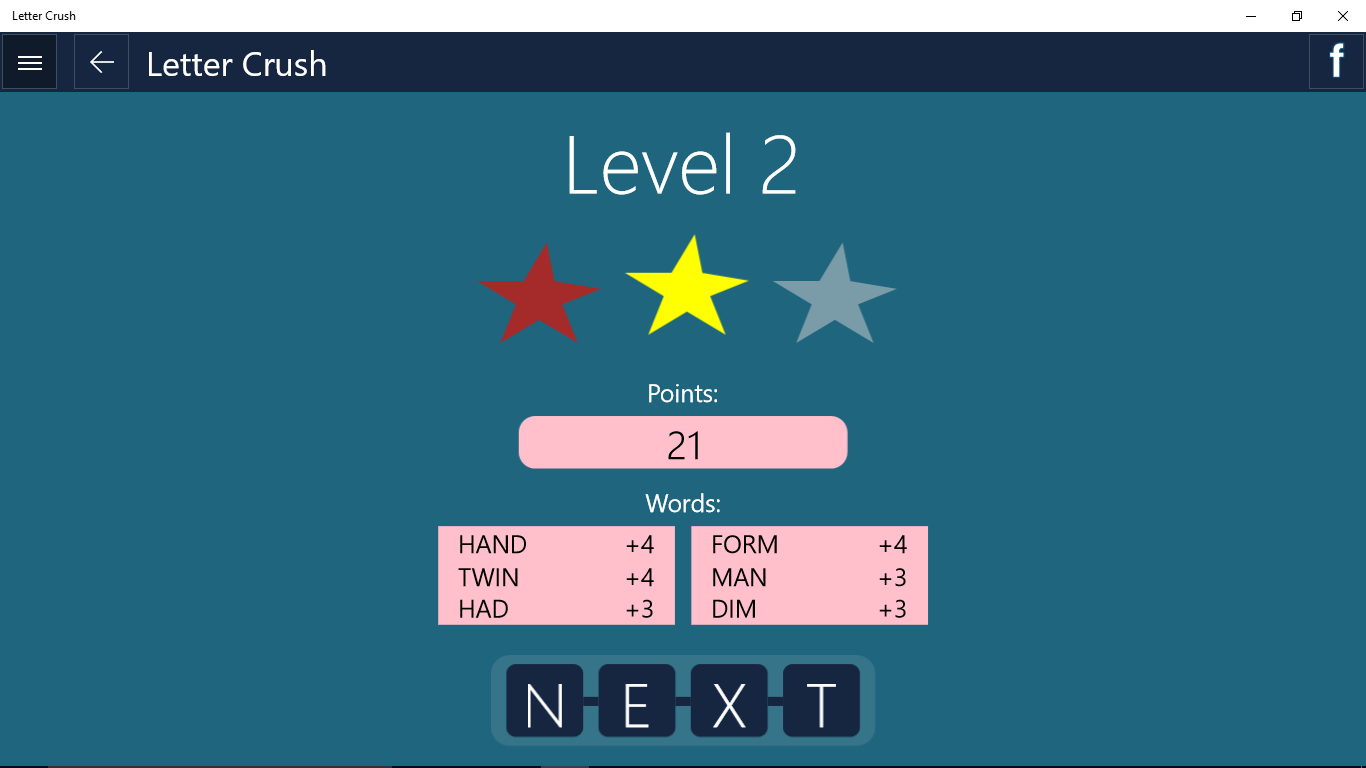 Letter Crush is the fun social word game that brings unique challenges to your vocabulary skills. Swipe tiles to form words and make your way through hundreds of levels in this gorgeous game. Invite your Facebook friends and compare your score with theirs on online leaderboards. Letter Crush is completely free to play but has some in-game "seek words" assists that require payment.