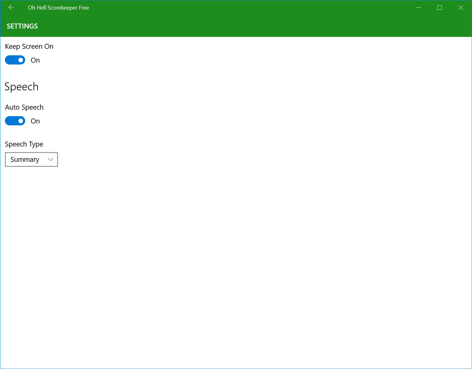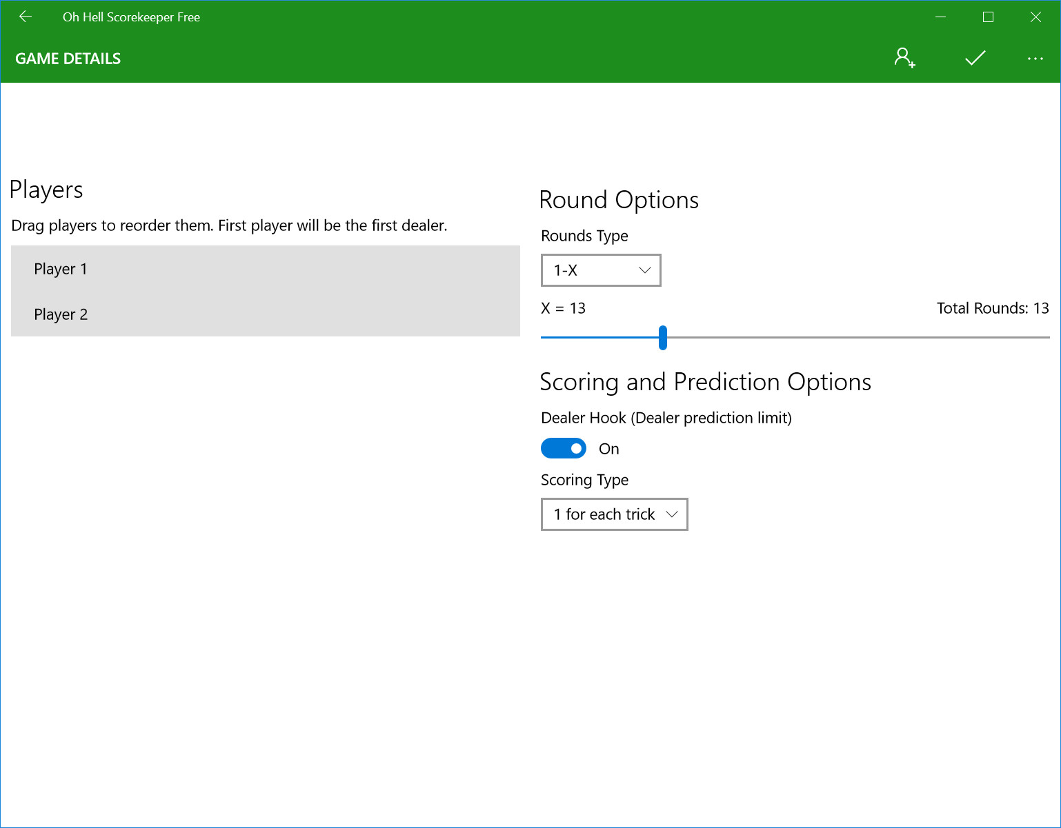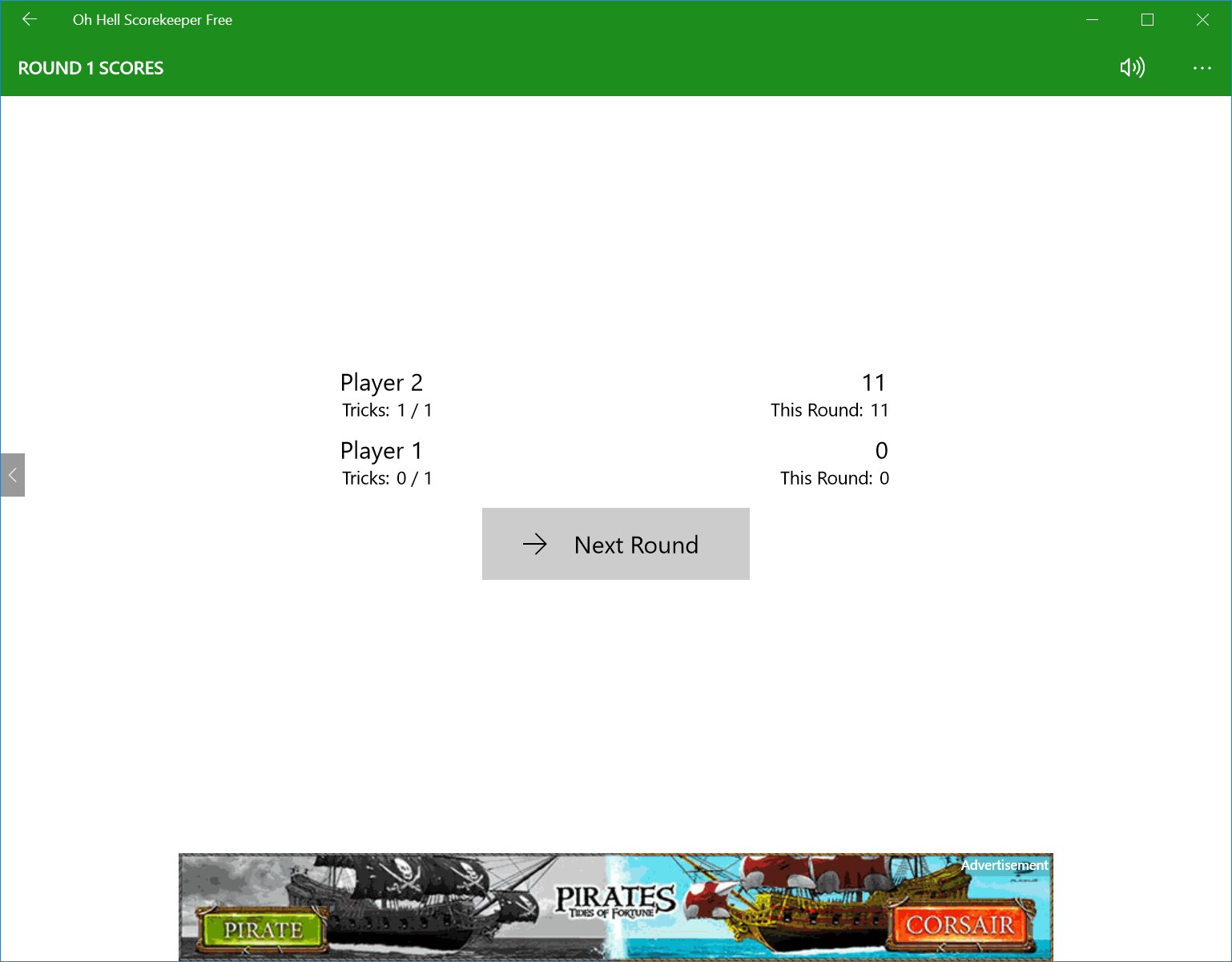 Keep track of your scores in the card game Oh HellEasily add players to your gameSelect how many rounds you want to play (including single and double deck options)Choose different round typesText to Speech is used to speak the screen while playing the game