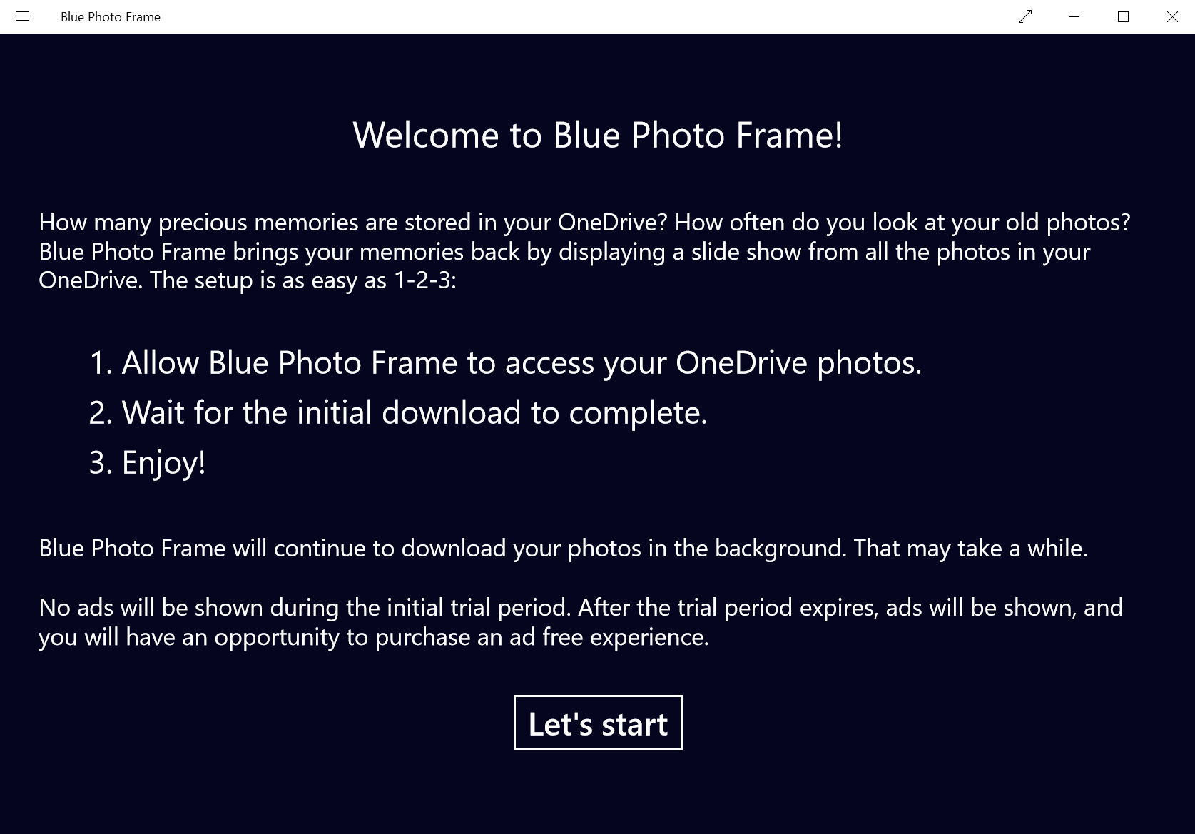 1. Allow Blue Photo Frame to access your OneDrive photos.