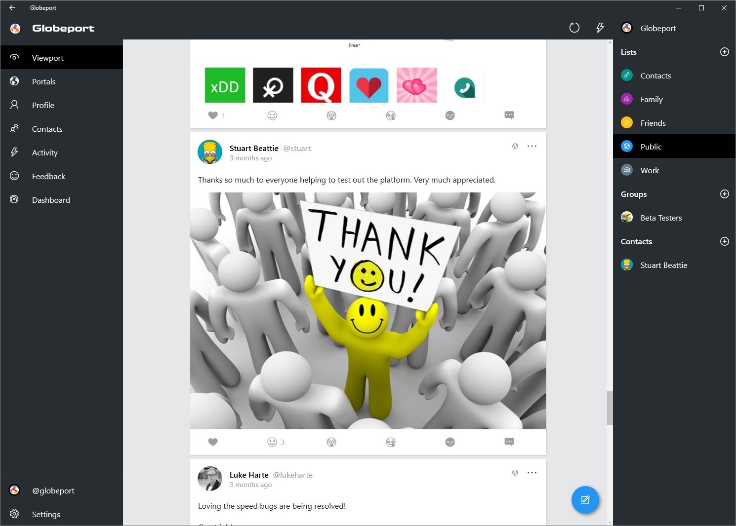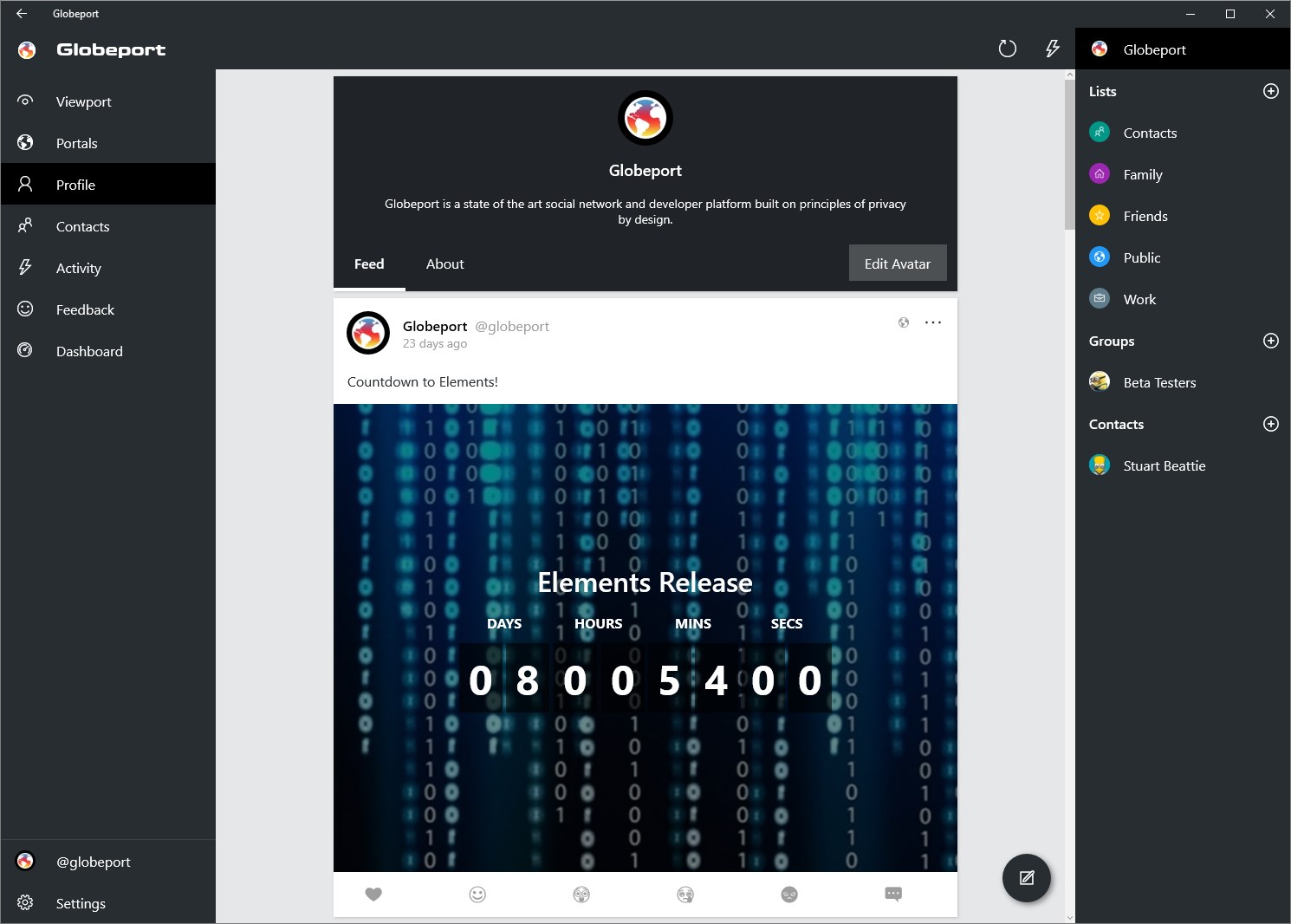 We want to build a platform that provides an alternative to the current free-for-all on personal data. Our platform will aim to provide all the features expected of a modern social network but with a focus on privacy and secure information exchange. Our developer app, Elements (coming soon) will allow anyone with basic coding knowledge to extend Globeport with rich interactive elements, features and user experiences - a creative playground to help shape the future of the platform.