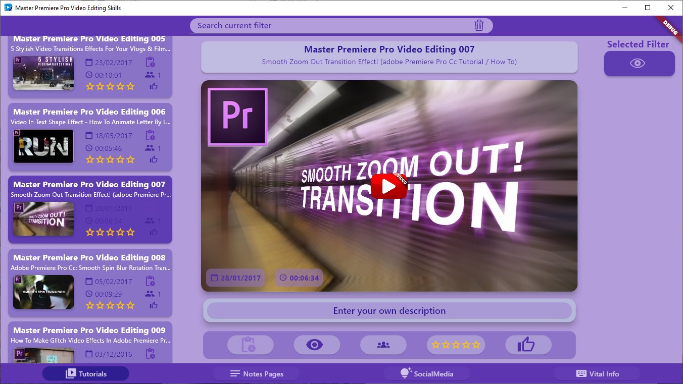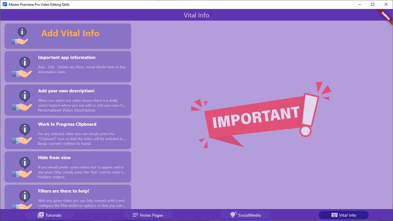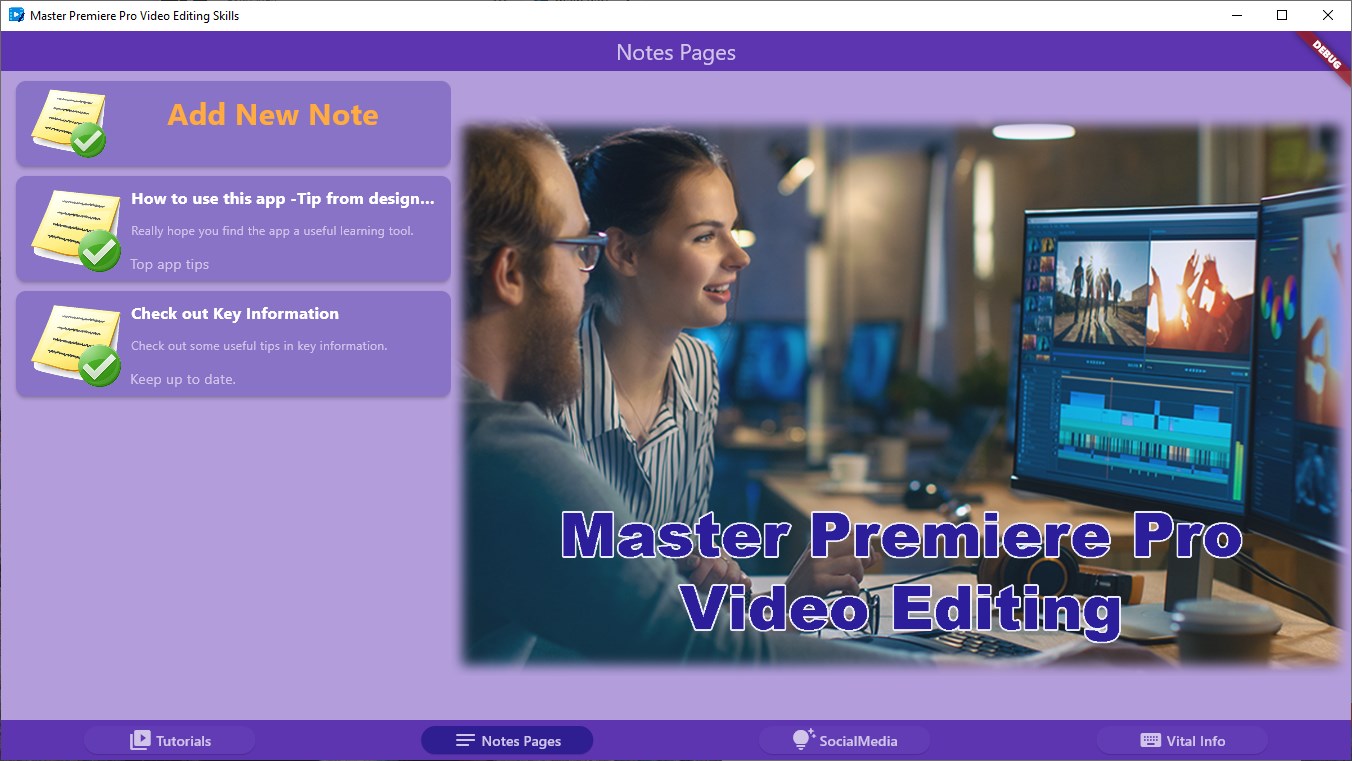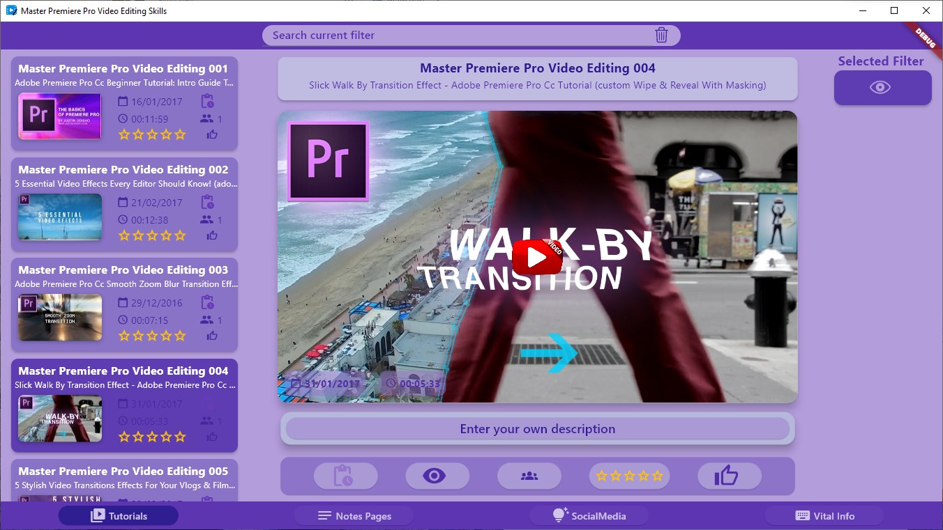 Quickly learn the skills you need to get up to speed with Adobe Premiere Pro Video Editing Software with this app that has 402 Video Tutorials, Guides and demos.The app has many interactive features to ensure that you can easily remember and or re visit valuable lessons.Add your own description for any lesson - this will immediately be searchable and will help you re find any lesson.You can add any lesson to the work in progress clipboard which will show on a dedicated work in progress filter which is available.Make lessons favourites, give them ratings and even hide their visibility if you dont want them to appear in the listingsKeep a customised set of \'Key Information\' details in the dedicated module so tou keep track of any vital info!Create one touch links to dedicated social media sites or user groups that are again self contained within the app and are there to assist you sharing or getting information as quickly as possibleKeep a dedicated list of vital important information in your own vital info module.