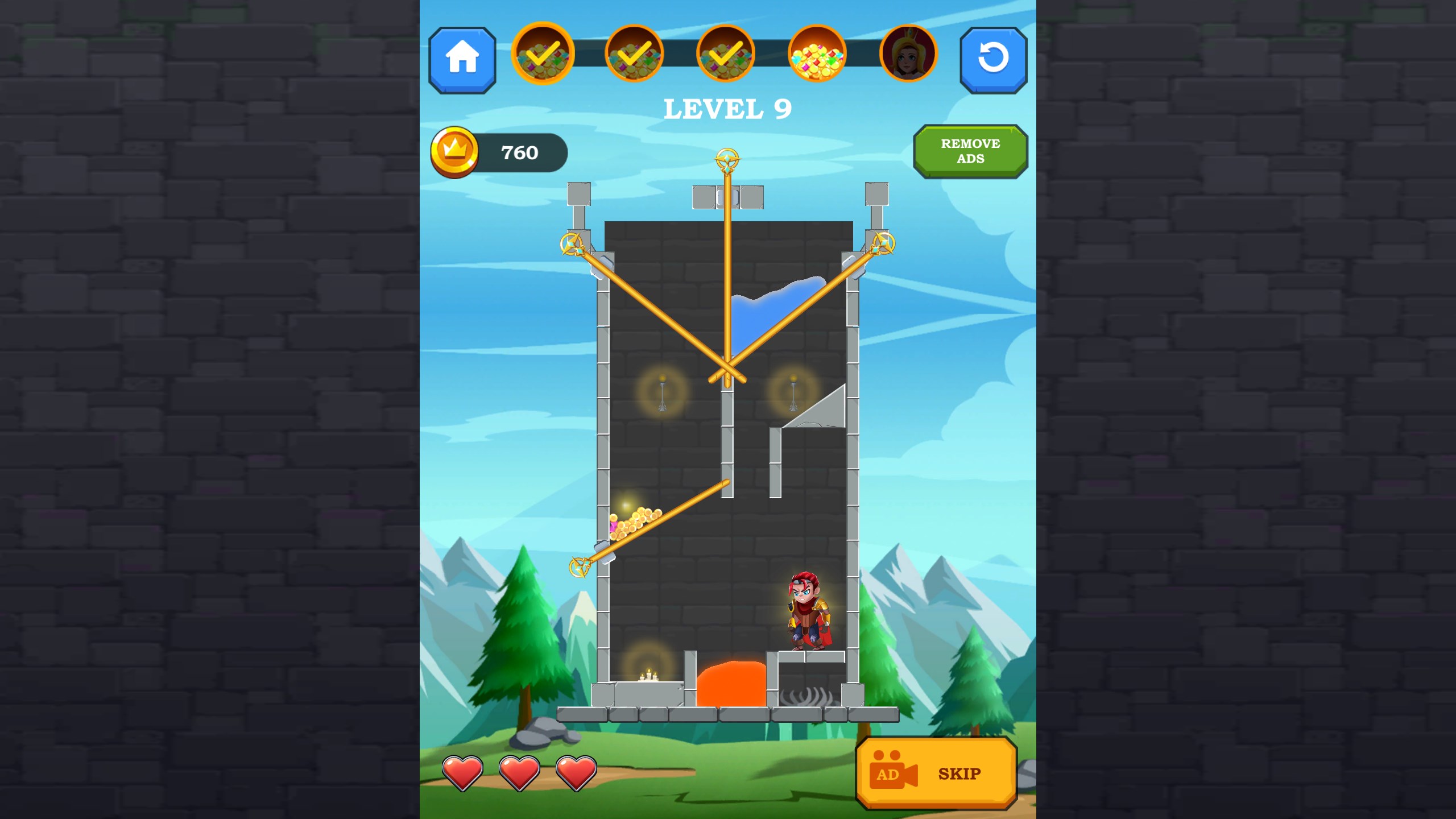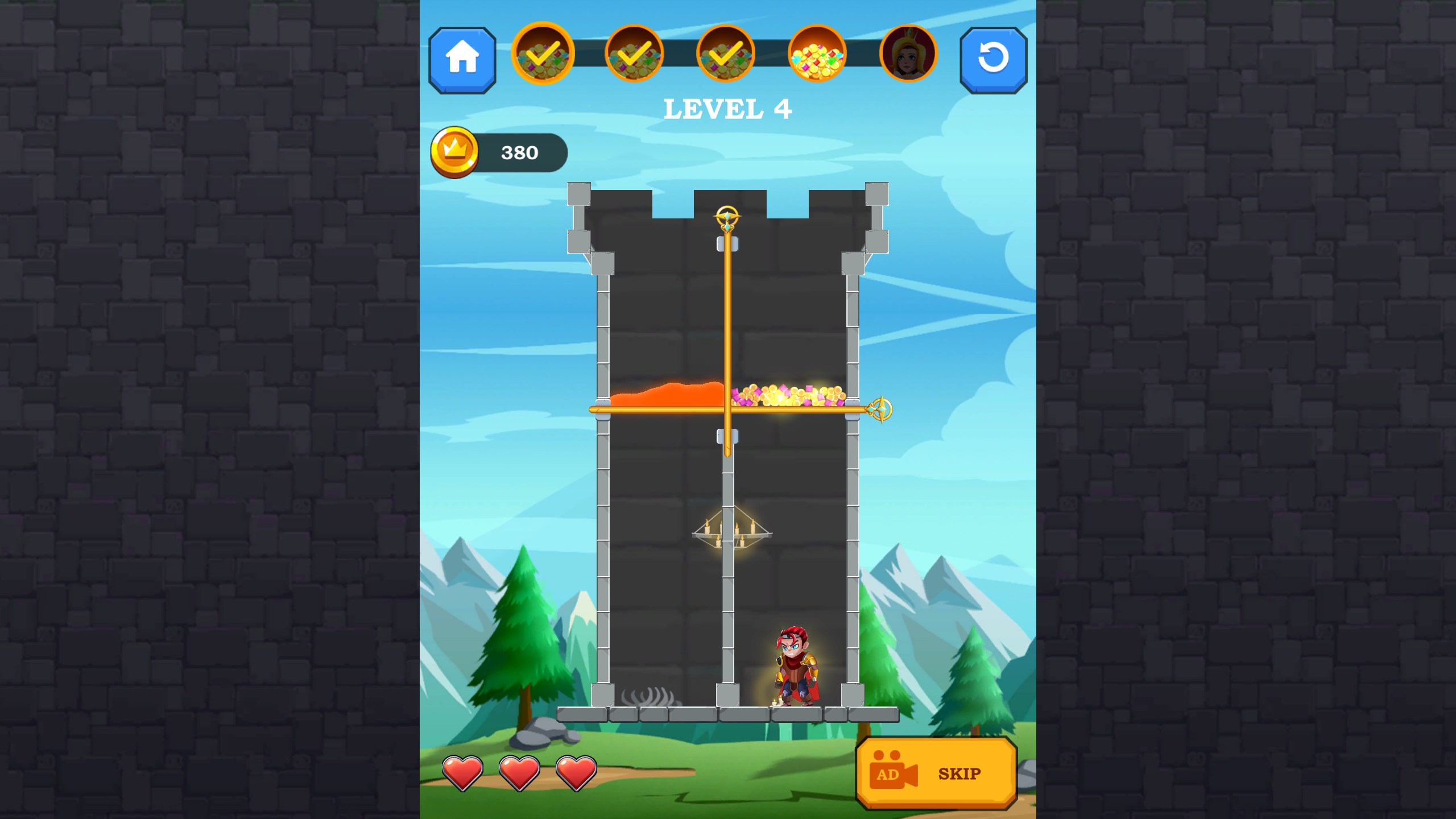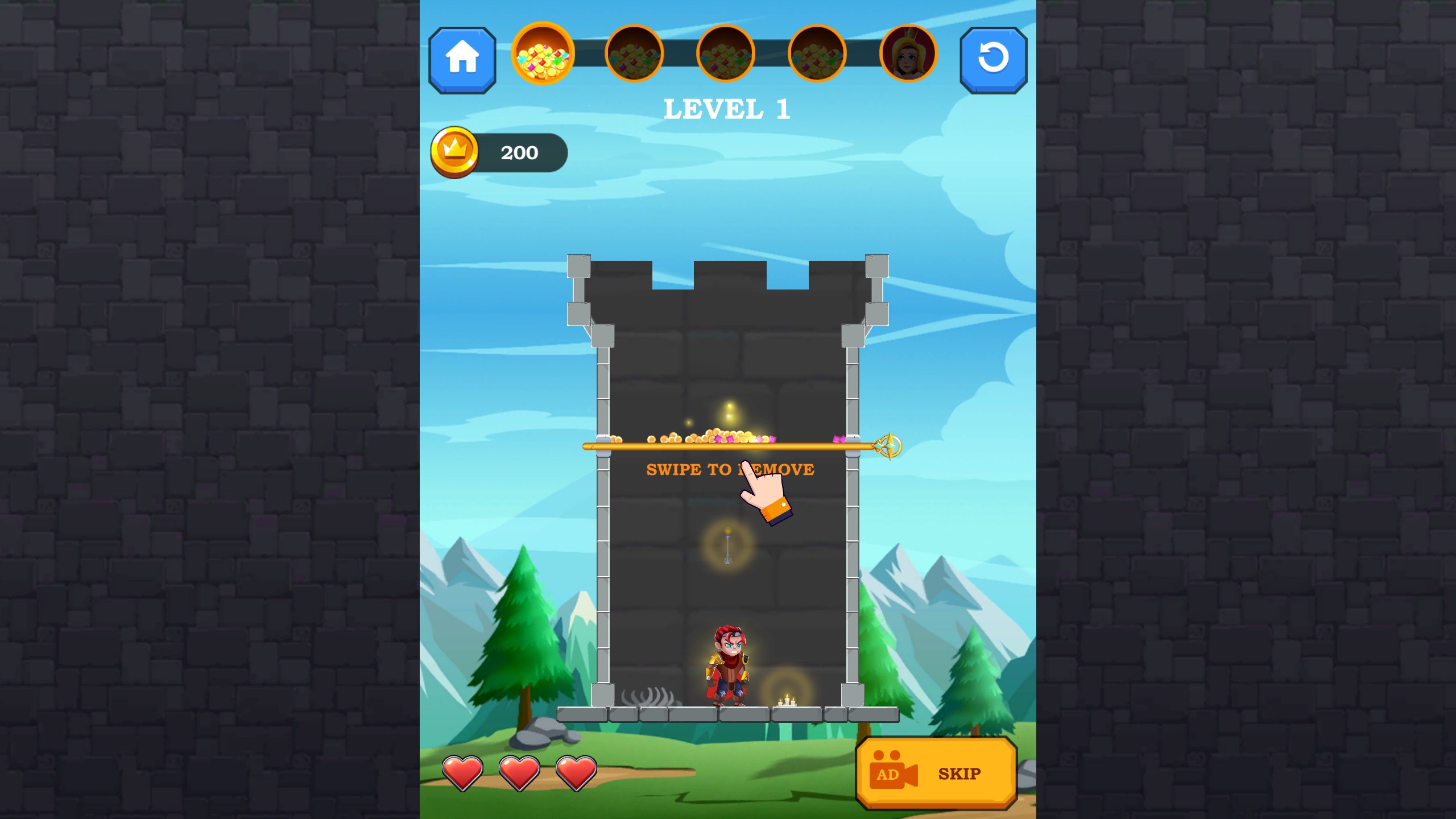 Hero Rescue Pin Puzzle is an exciting puzzle game where your mission is to guide the hero through dangerous challenges to rescue the princess and collect treasures. Carefully pull the pins to avoid traps, defeat enemies, and solve intricate puzzles. Each level presents a unique challenge that tests your logic and strategic thinking. Embark on this thrilling adventure, save the princess, and uncover hidden treasures in this fun and addictive puzzle journey!