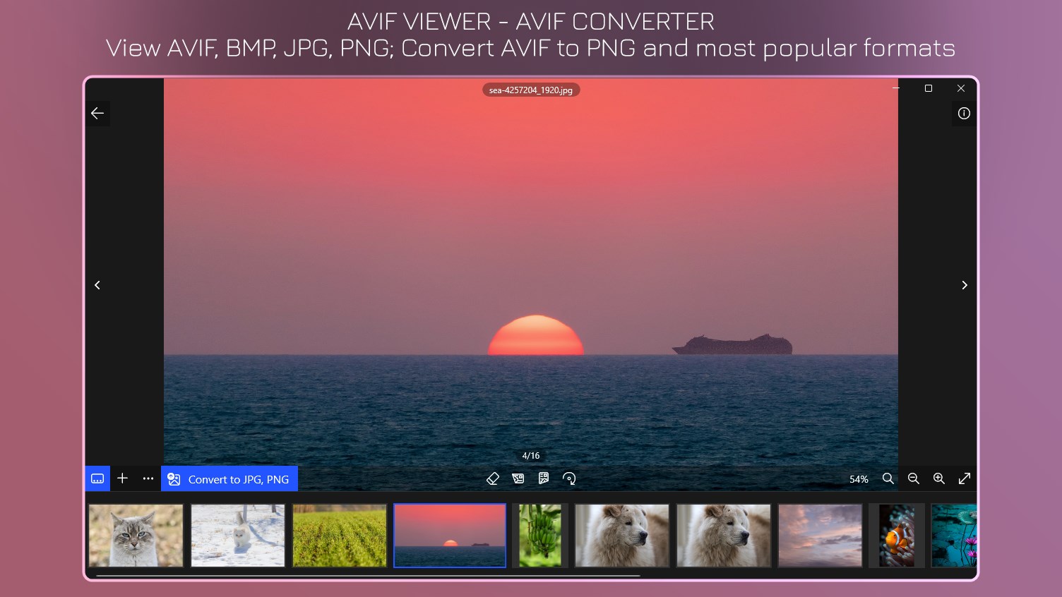 View AVIF and popular image formats - convert AVIF to to PNG, JPG, BMP.