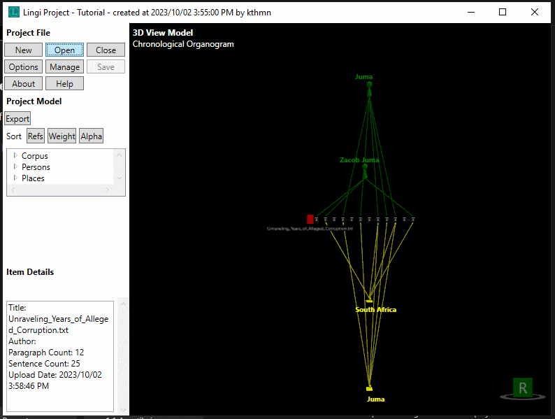 Lingi is a Windows application which uses Artificial Intelligence Natural Language Processing to automatically extract Person and Place names from text and displays the resulting model in a three-dimensional view. Additionally, it provides tools to edit, filter and export the resulting model and summarized text.
