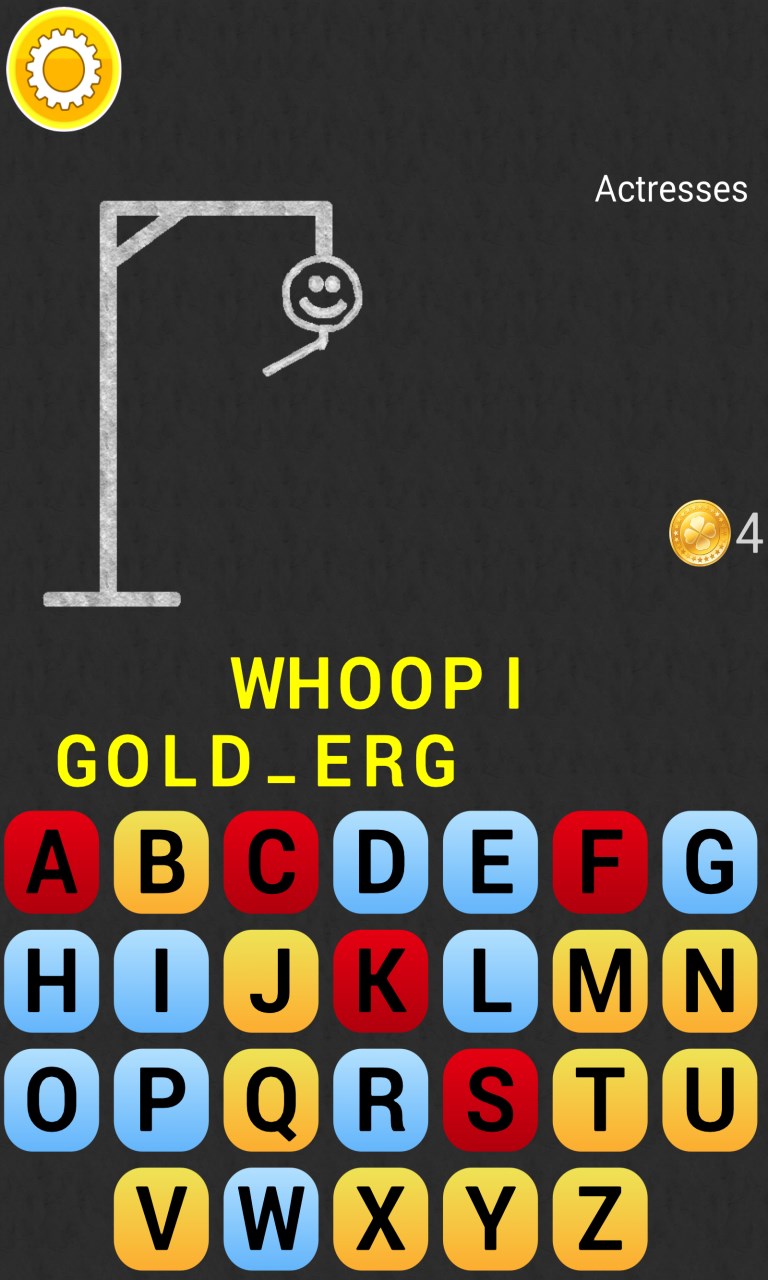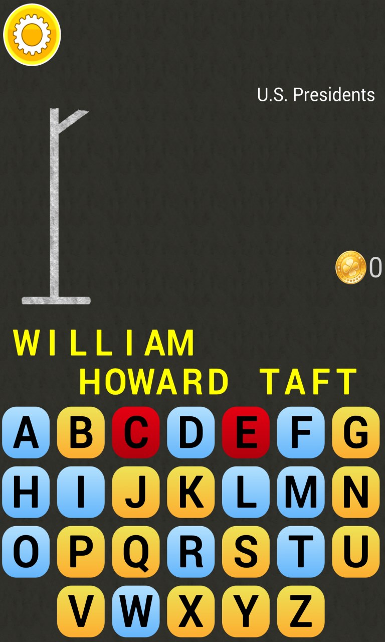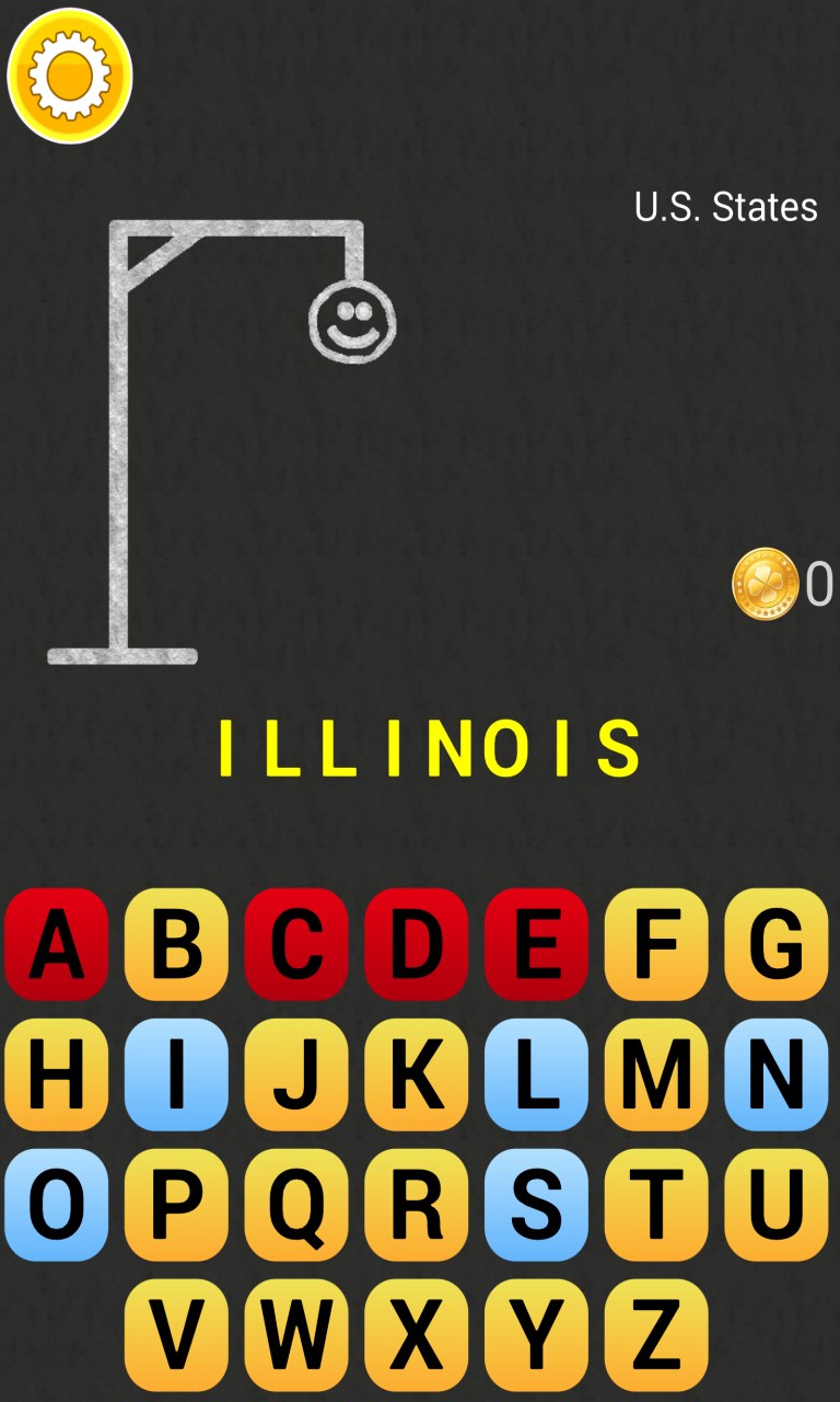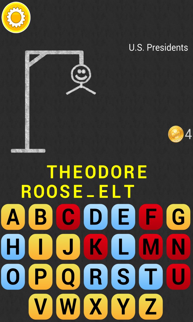 Play Hangman - a captivating word guessing game.You can test your mastery with words from different categories. 10 categories: countries, capitals, US states, US presidents, animals, actresses, actors, films, music, soccer teams
