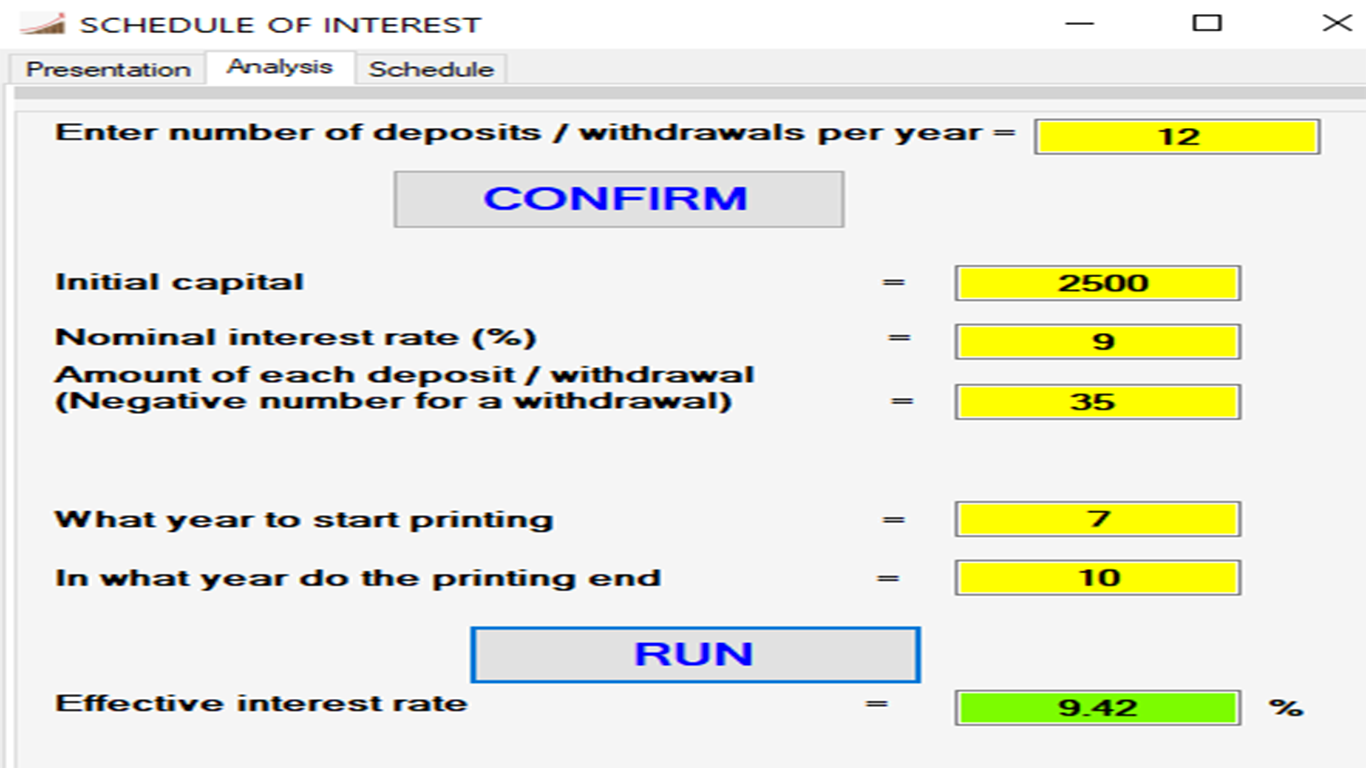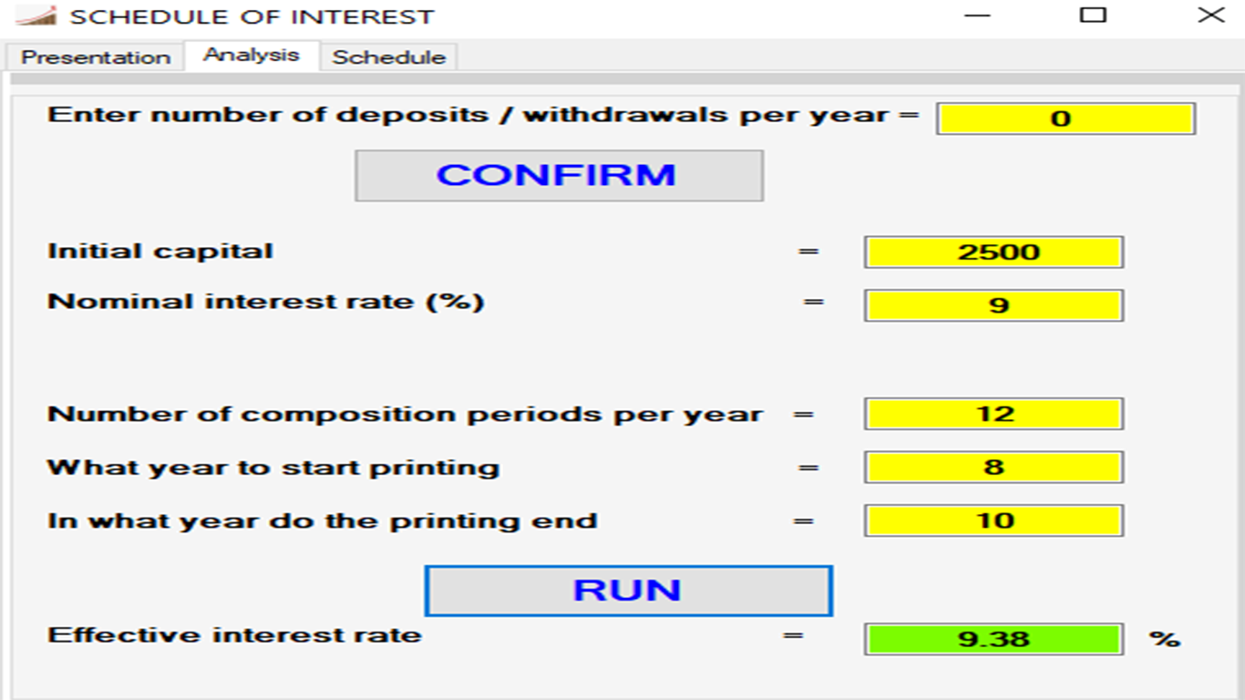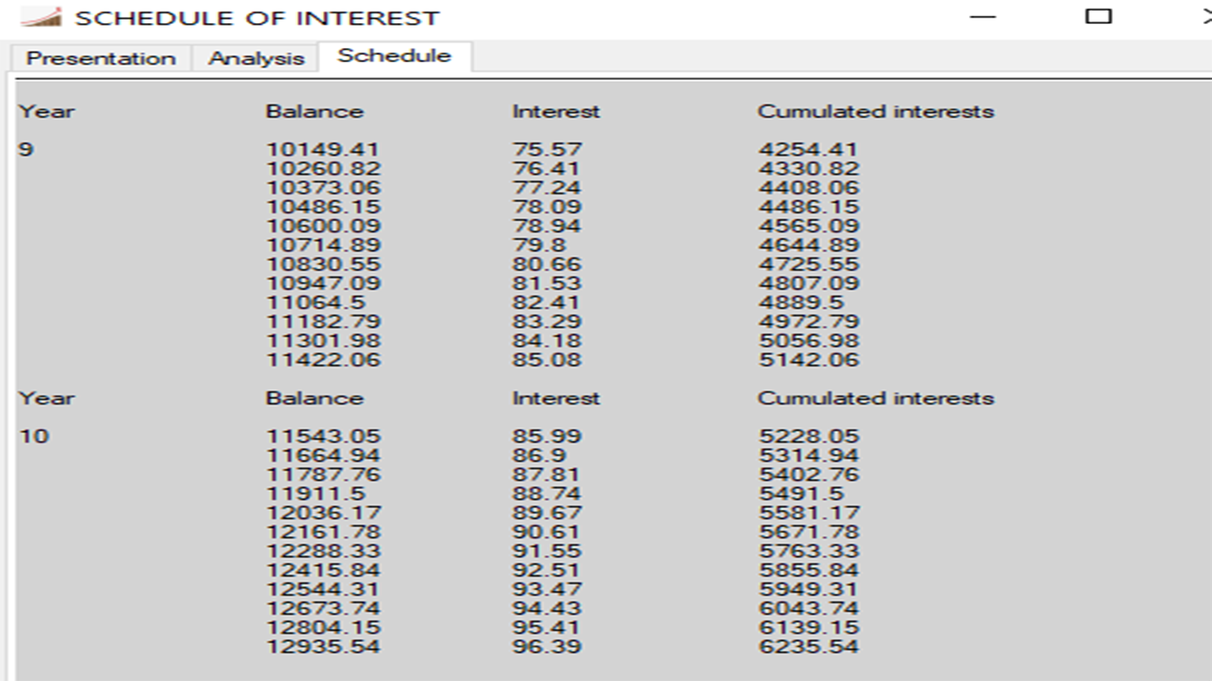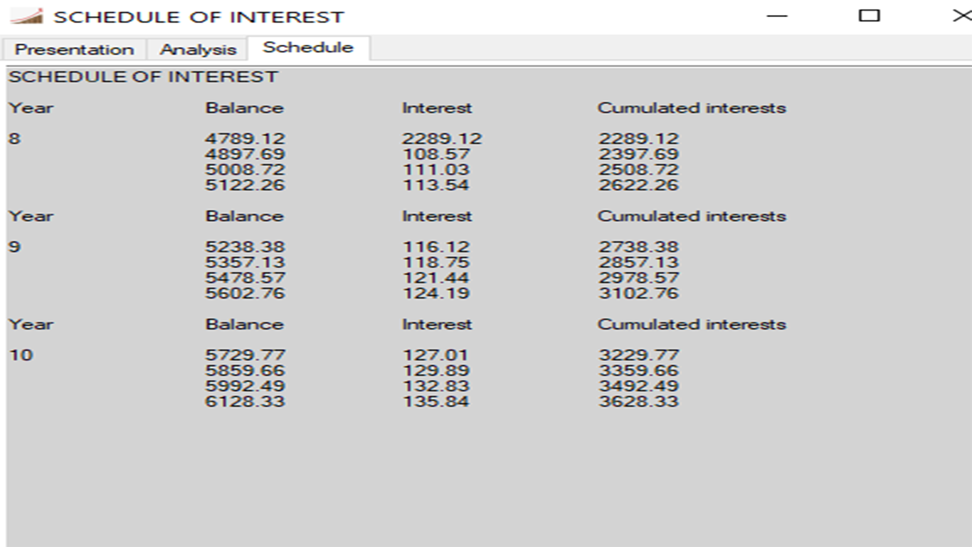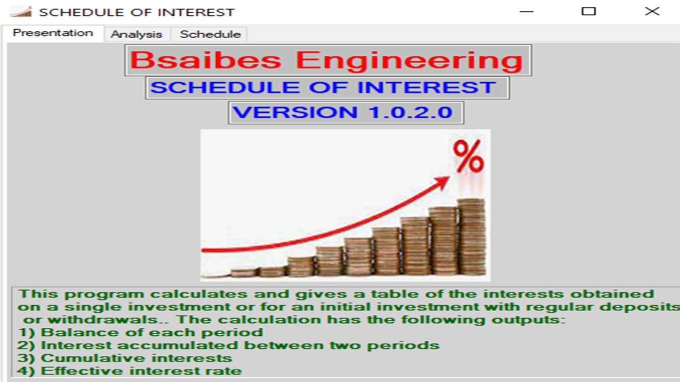 This program calculates and gives a table of the interests obtained on a single investment or for an initial investment with regular deposits
