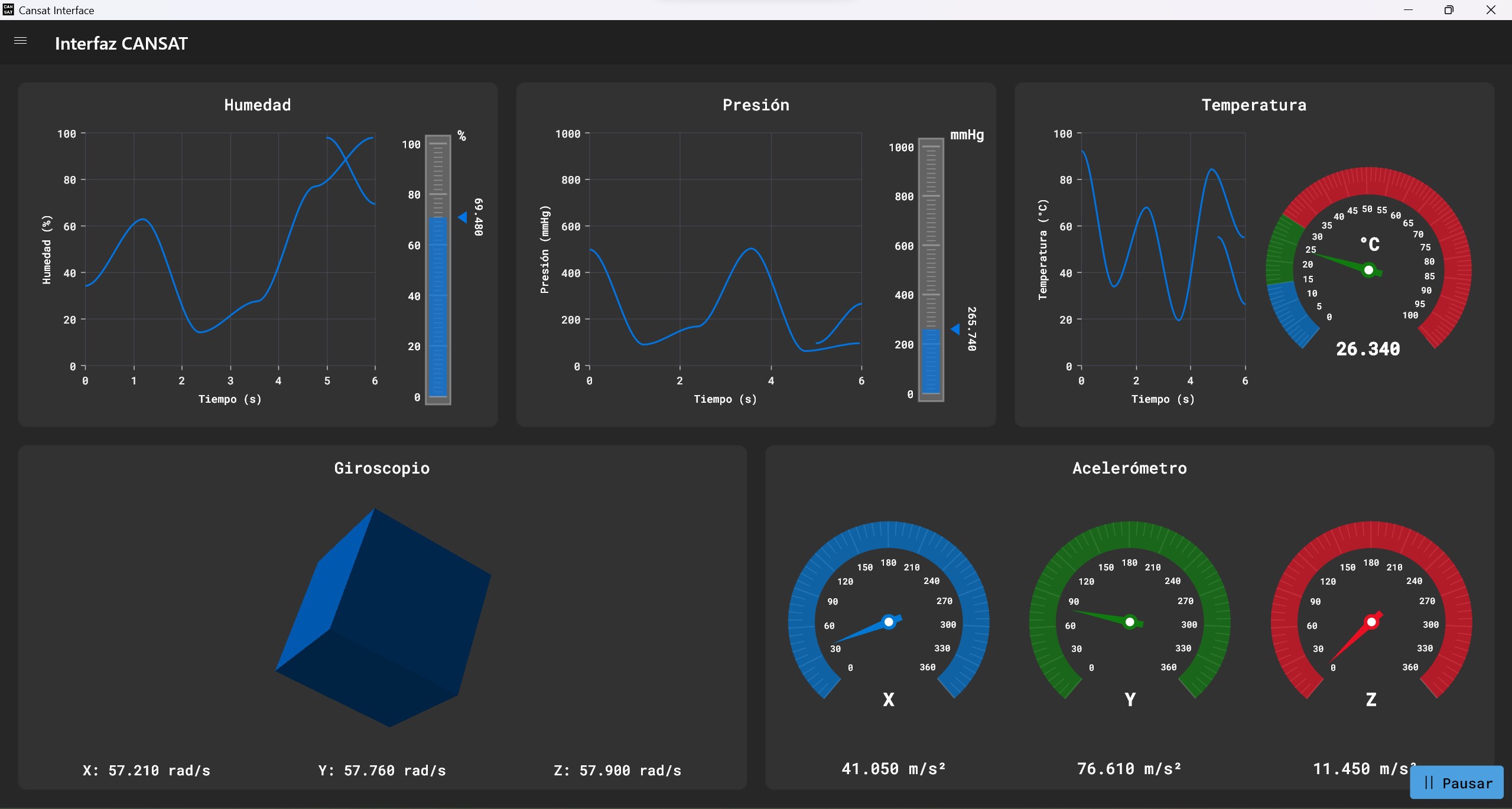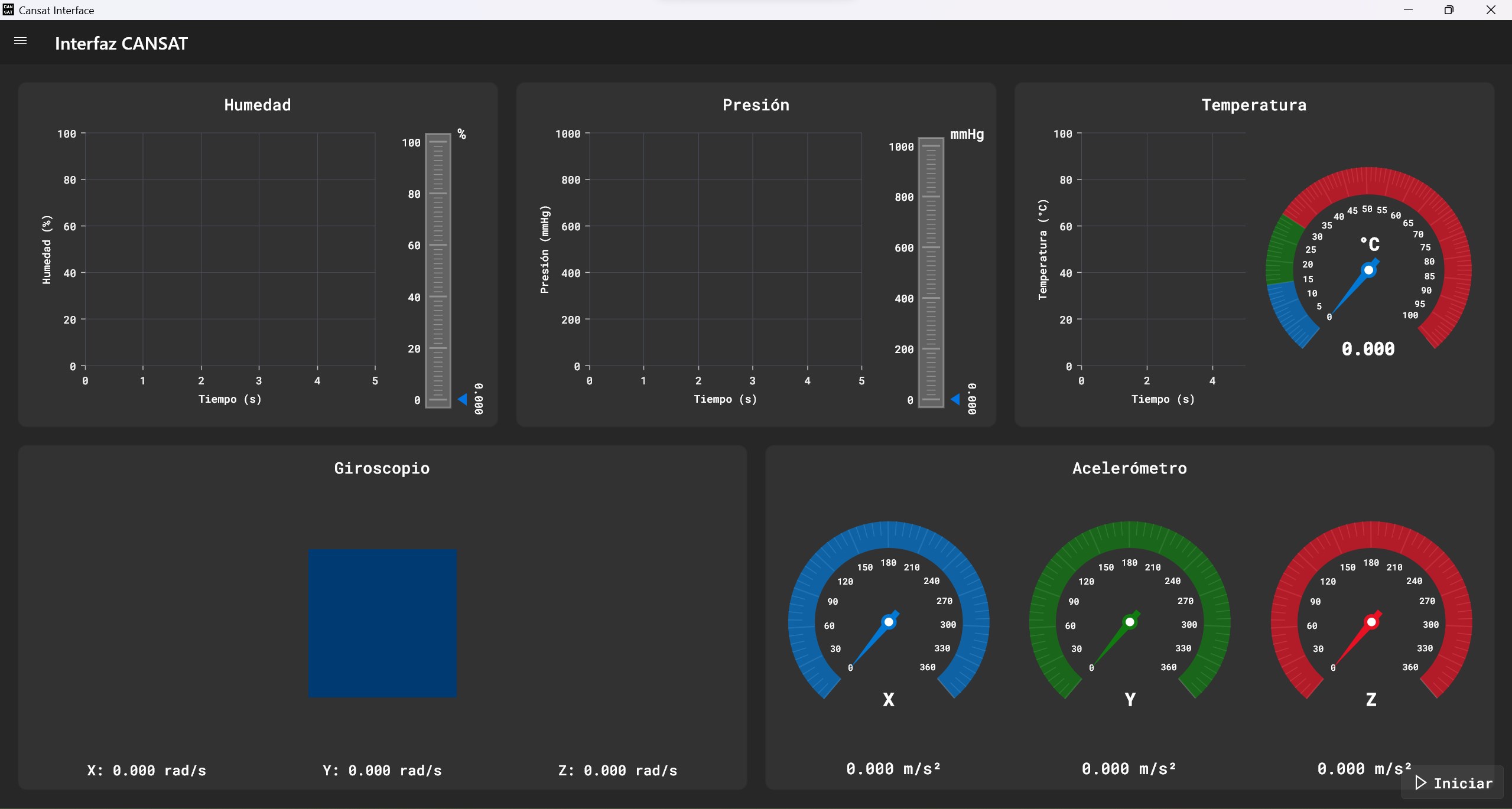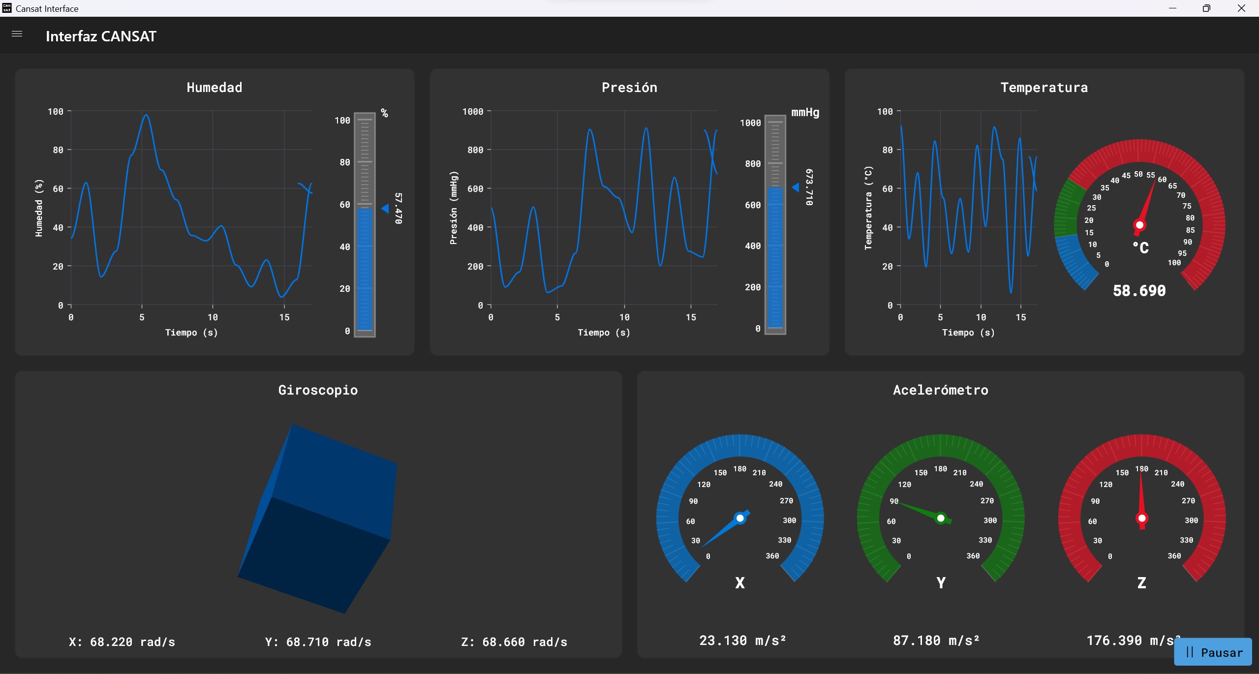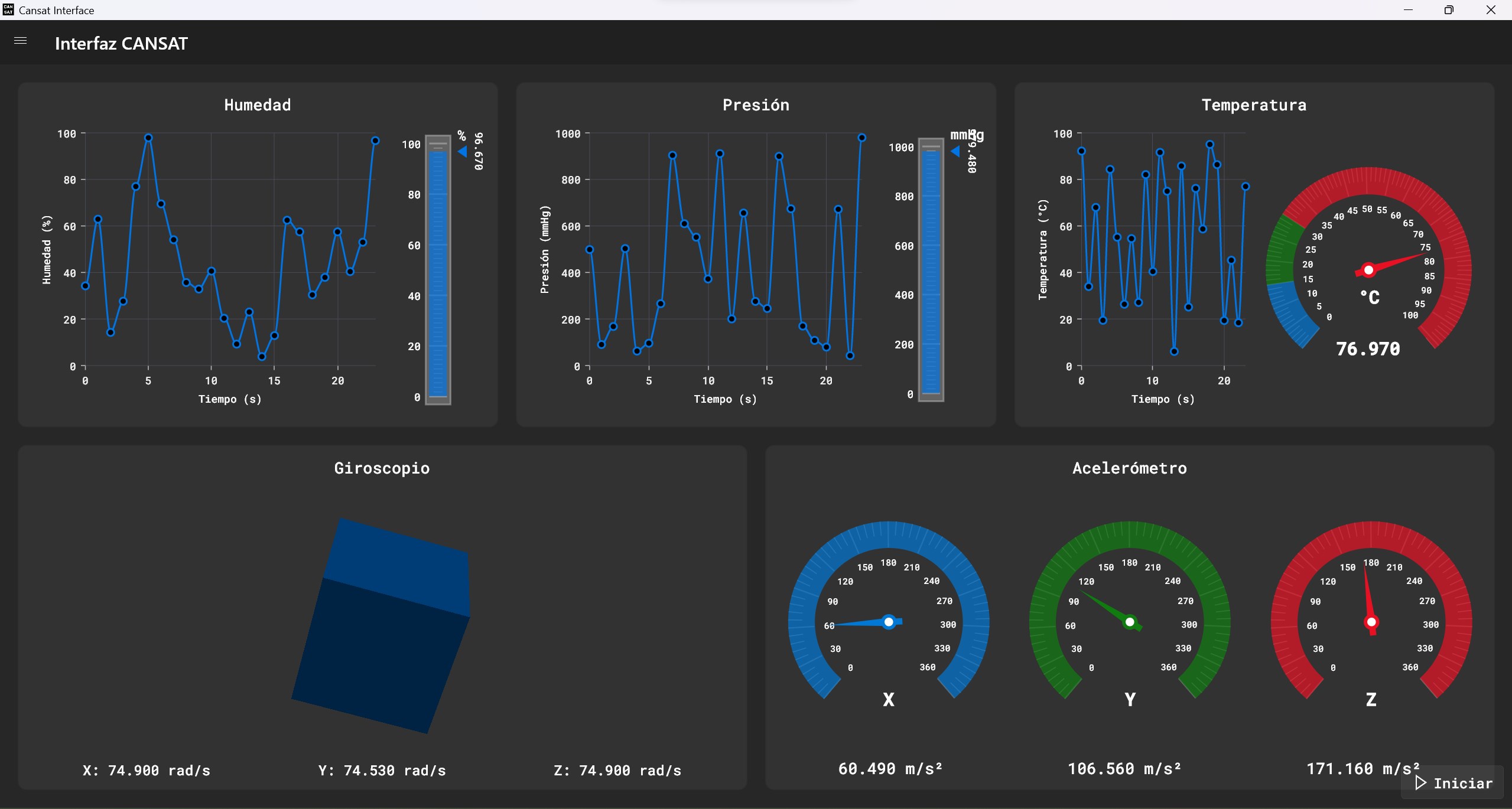 Aplicación de monitoreo de sensores de satelite CANSAT conectado por broker MQTT. Permite capturar datos de humedad, presión, temperatura y mostrarlos como gráfico y el historial de mediciones racibidas. Además permite visualizar datos de giroscopio en 3D y datos de acelerómetro de forma radial.