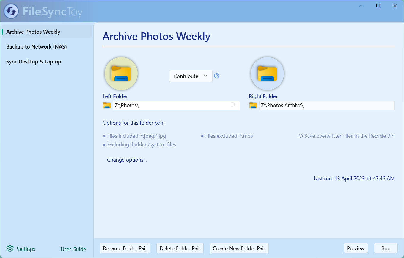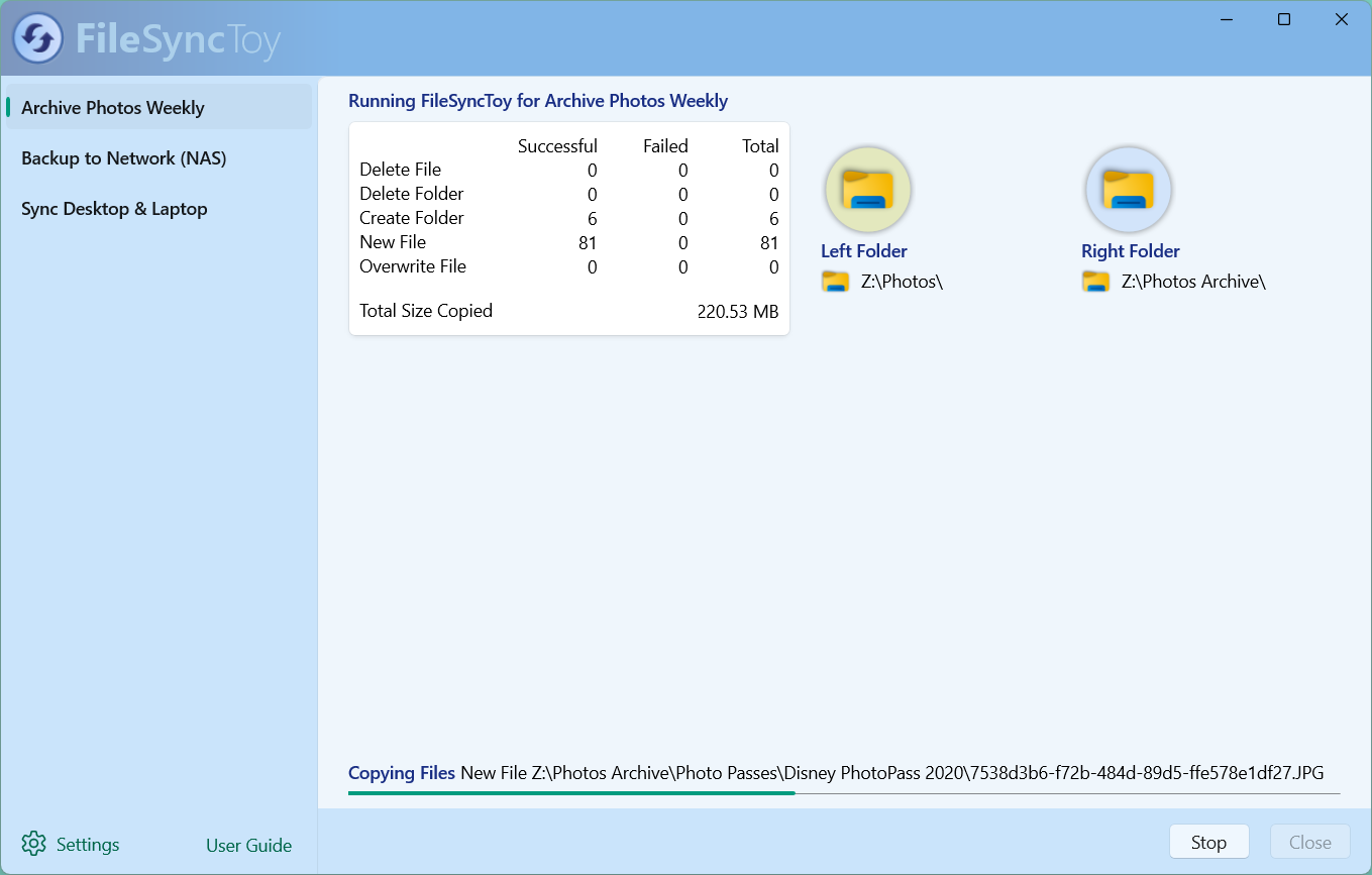 FileSyncToy synchronizes, copies, and backs-up folders and files on your computer or computers.
