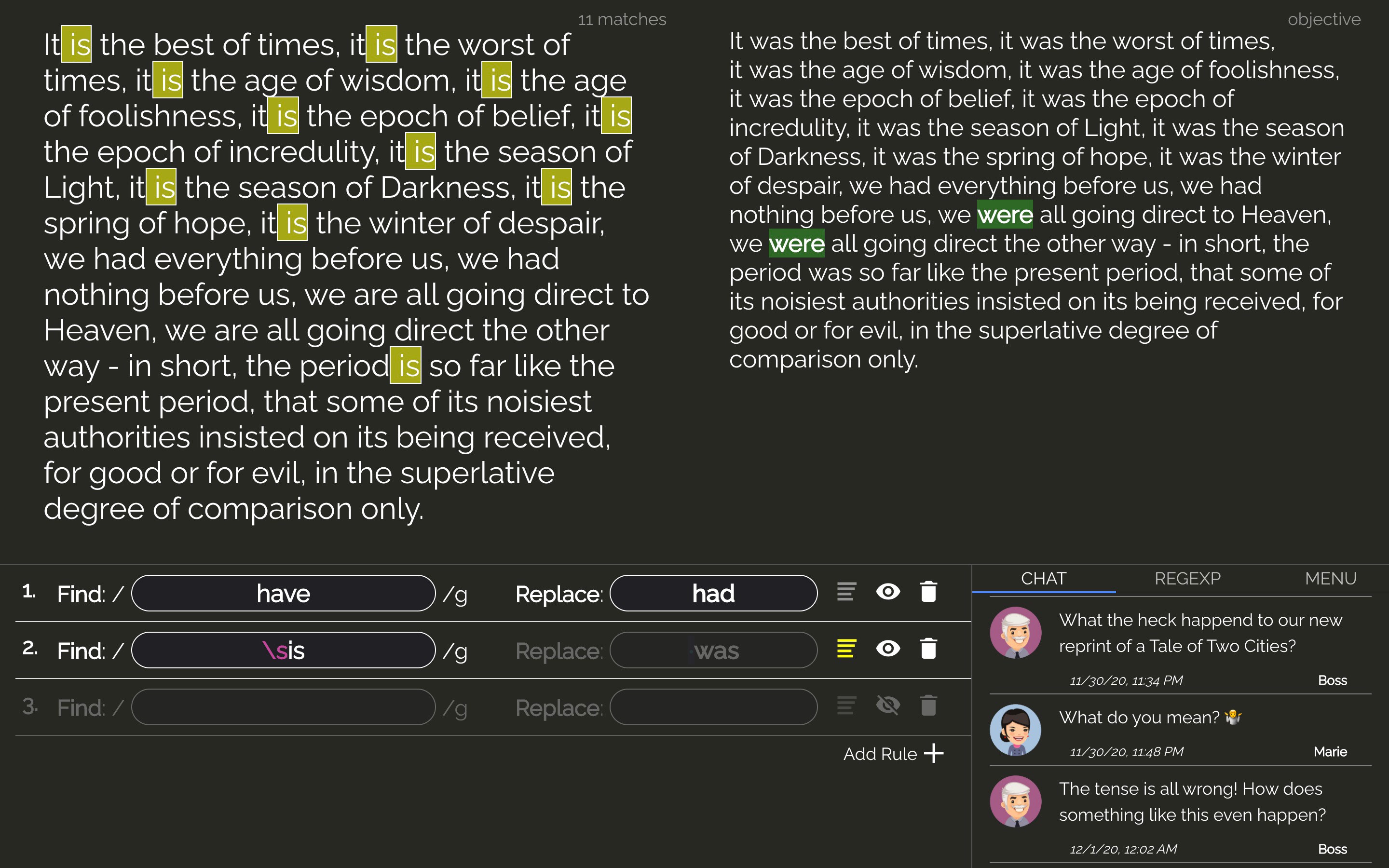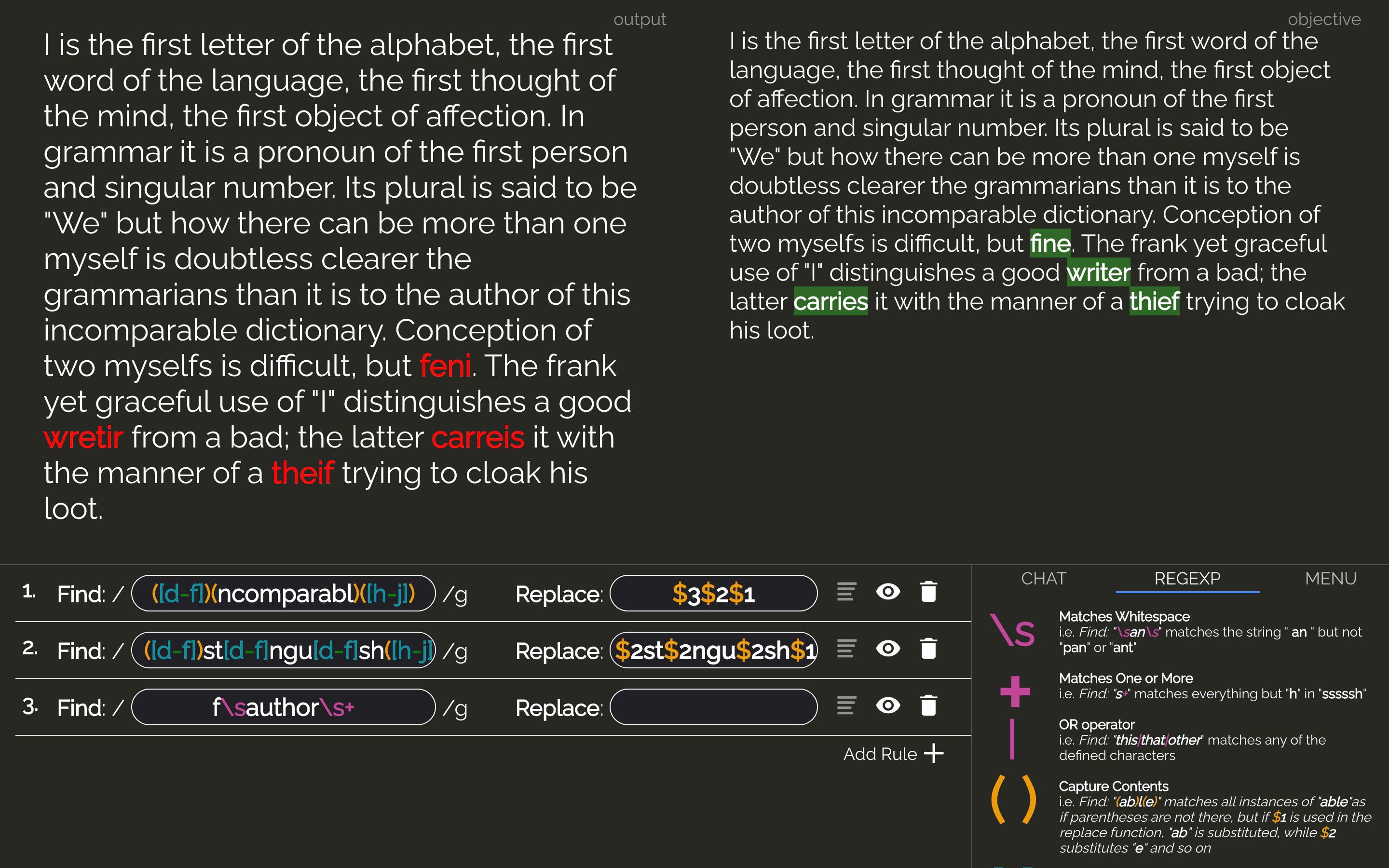 Copy Editor is an intricate puzzle game that teaches you Regular Expressions (RegEx), commonly used in computer science and language theory. Build complex rules that process and revise famous texts for your wacky and demanding publishers!