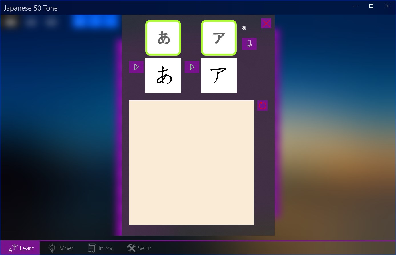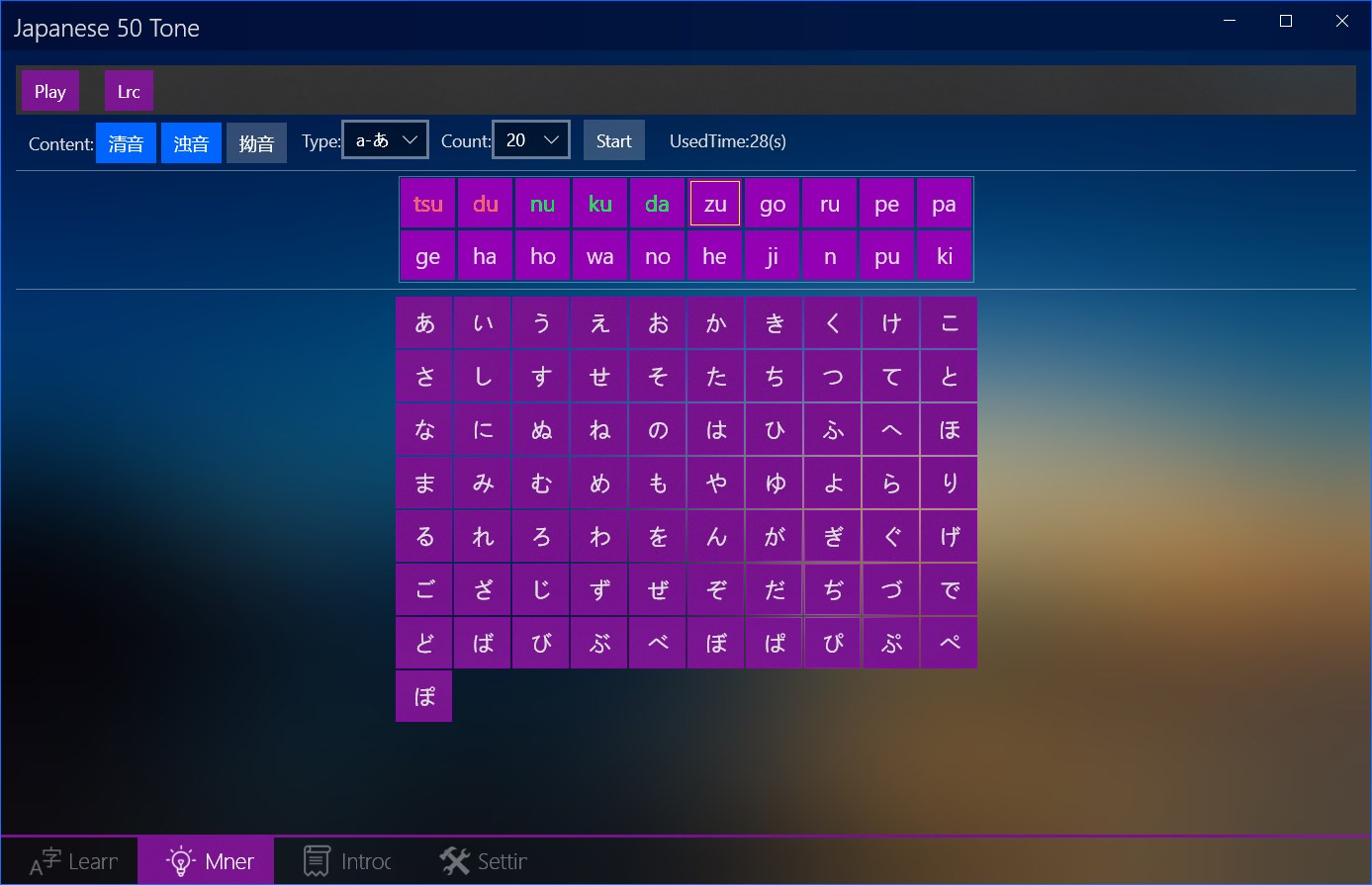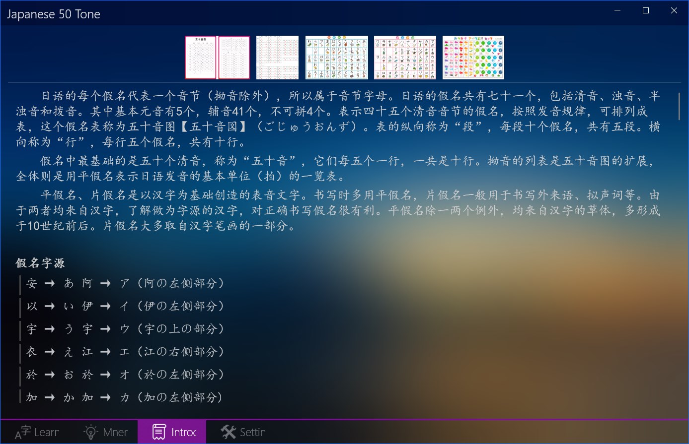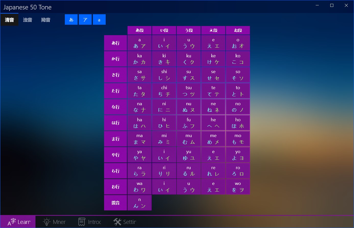 This application can be used as an auxiliary tool to learn 50 tone map, including pronunciation learning, writing learning, writing practice, memory training, etc., can promote the learning and memory of 50 tone map, so as to lay a good foundation for learning Japanese.