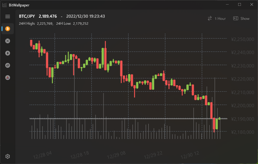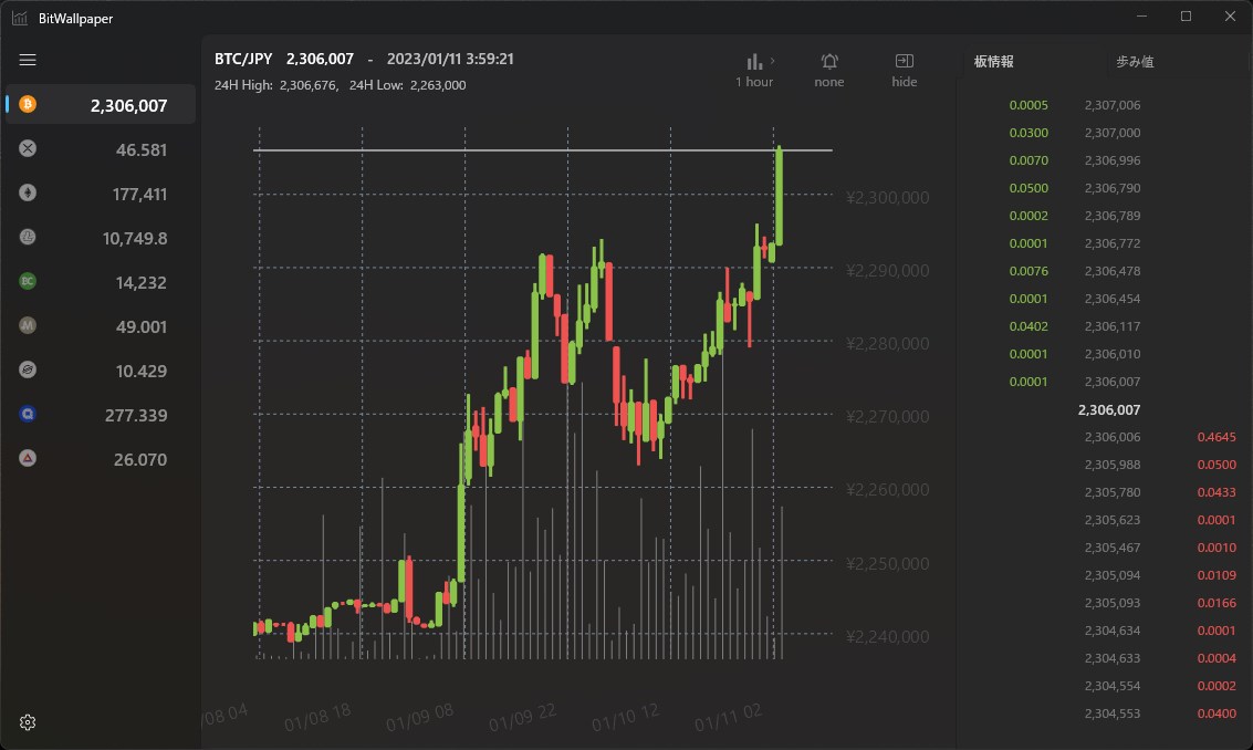 Displays BTC/JPY, XRP/JPY, ETH/JPY, LTC/JPY, MONA/JPY, BCC/JPY, XLM/JPY, QTUM/JPY, BAT/JPY, OMG/JPY, XYM/JPY, LINK/JPY, MKR/JPY, BOBA/JPY, ENJ/JPY, MATIC/JPY, DOT/JPY, DOGE/JPY, ASTR/JPY, ADA/JPY, AVAX/JPY, AXS/JPY, FLR/JPY, SAND/JPY.