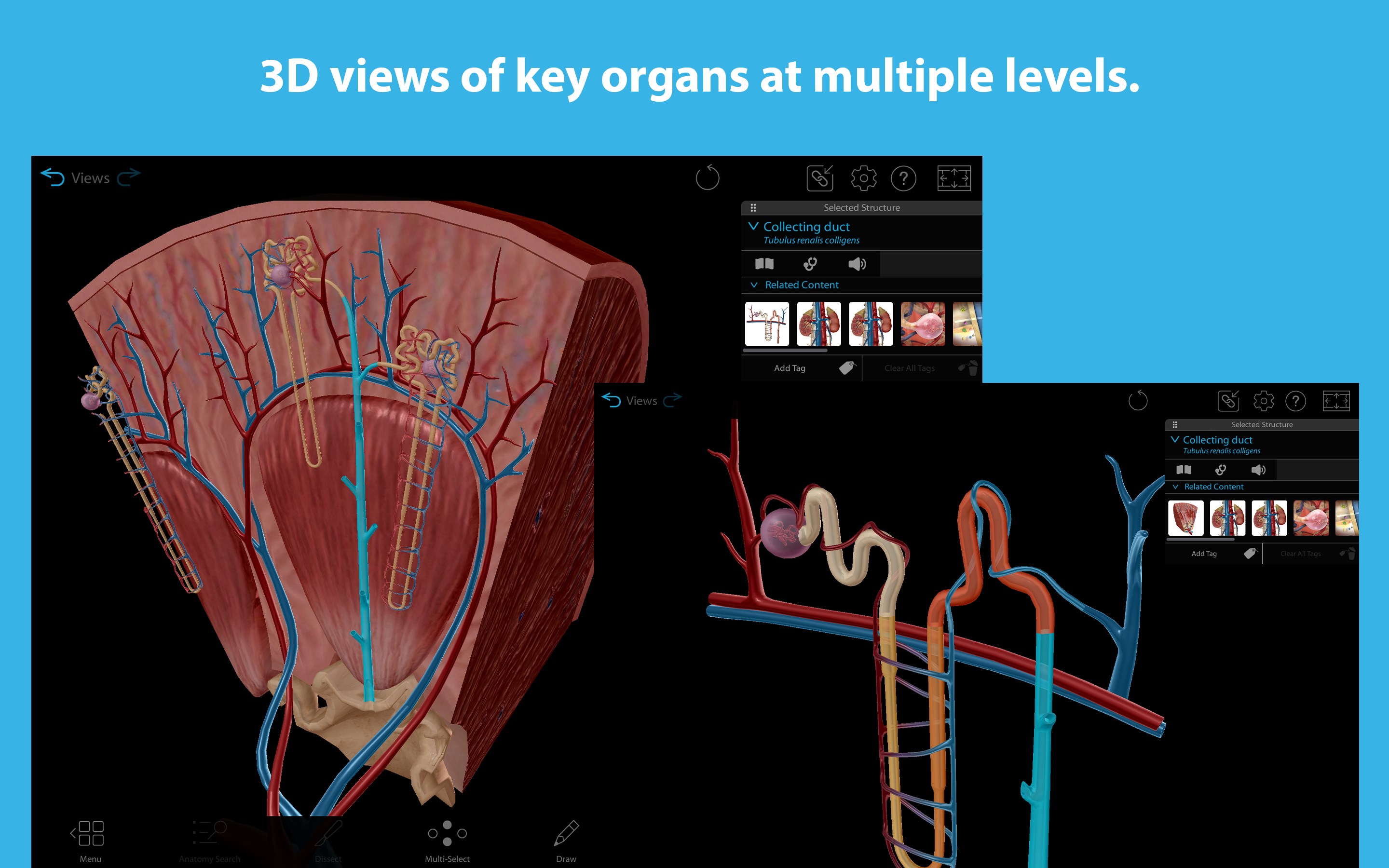 * 3D views of key organs at multiple levels. Study the lungs, bronchi, and alveoli; Review the kidneys, renal pyramids, and nephrons.