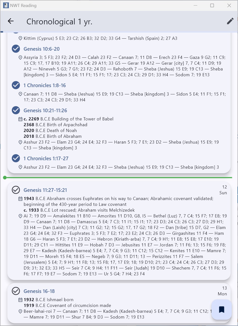 Supports reading the Bible in all available languages of the complete New World Translation, including sign languages.Scriptures open in the JW Library® app.Tracks your reading progress and shows the number of days you are ahead or behind schedule.Offers several reading plans: canonical, in the order the Bible books were written, and chronologically, as the events took place.Allows you to select the reading speed or read without a specific end date.Highlights dates with key events in the chronological plan.Shows locations mentioned in each section and where to find them in the brochure \“See the Good Land.\”Use multiple Bible reading plans in parallel.Enjoy a dark mode theme for a more comfortable reading experience.NWT Reading is open source! Find us on GitHub and contribute.User interface available in Czech, English, French, German, Hungarian, Italian, Polish, Portuguese (Brazil), Romanian, Russian, and Spanish.
