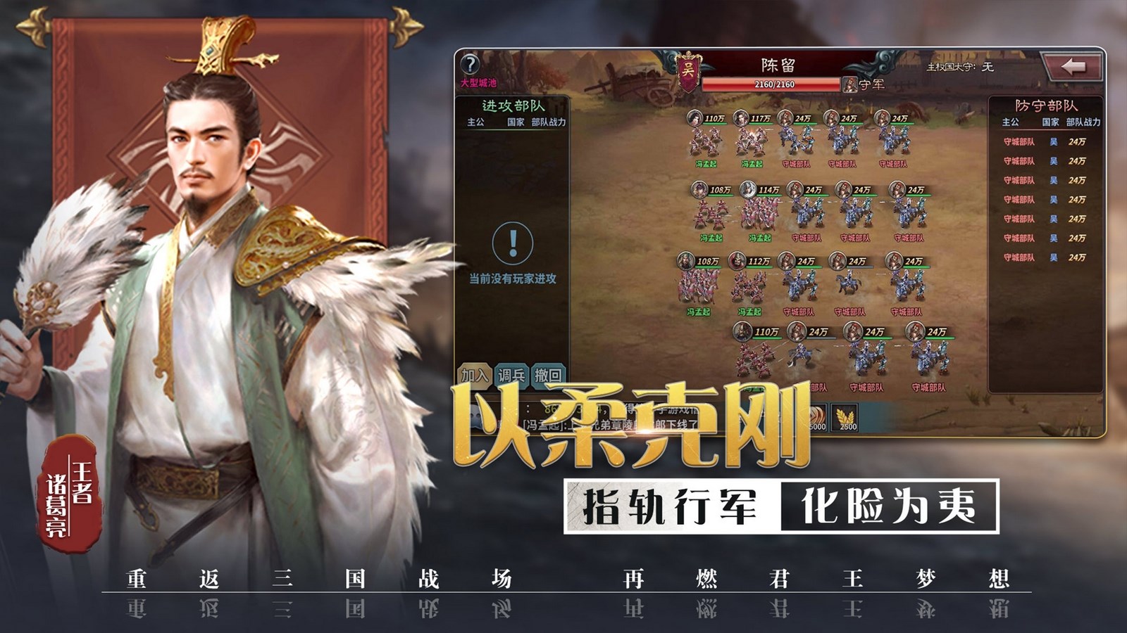 遊戲一改傳統三國遊戲的虛擬主城玩法模式,以三國曆史真實的地圖為藍本,全方位還原160餘個城池,100餘個三國武將,以及20多種攻城器械,10餘種兵種都將依次登場。