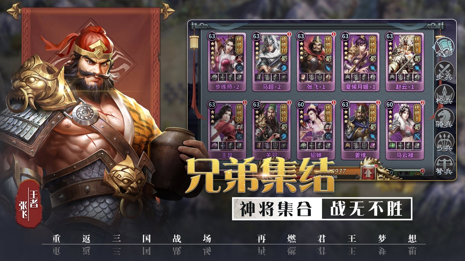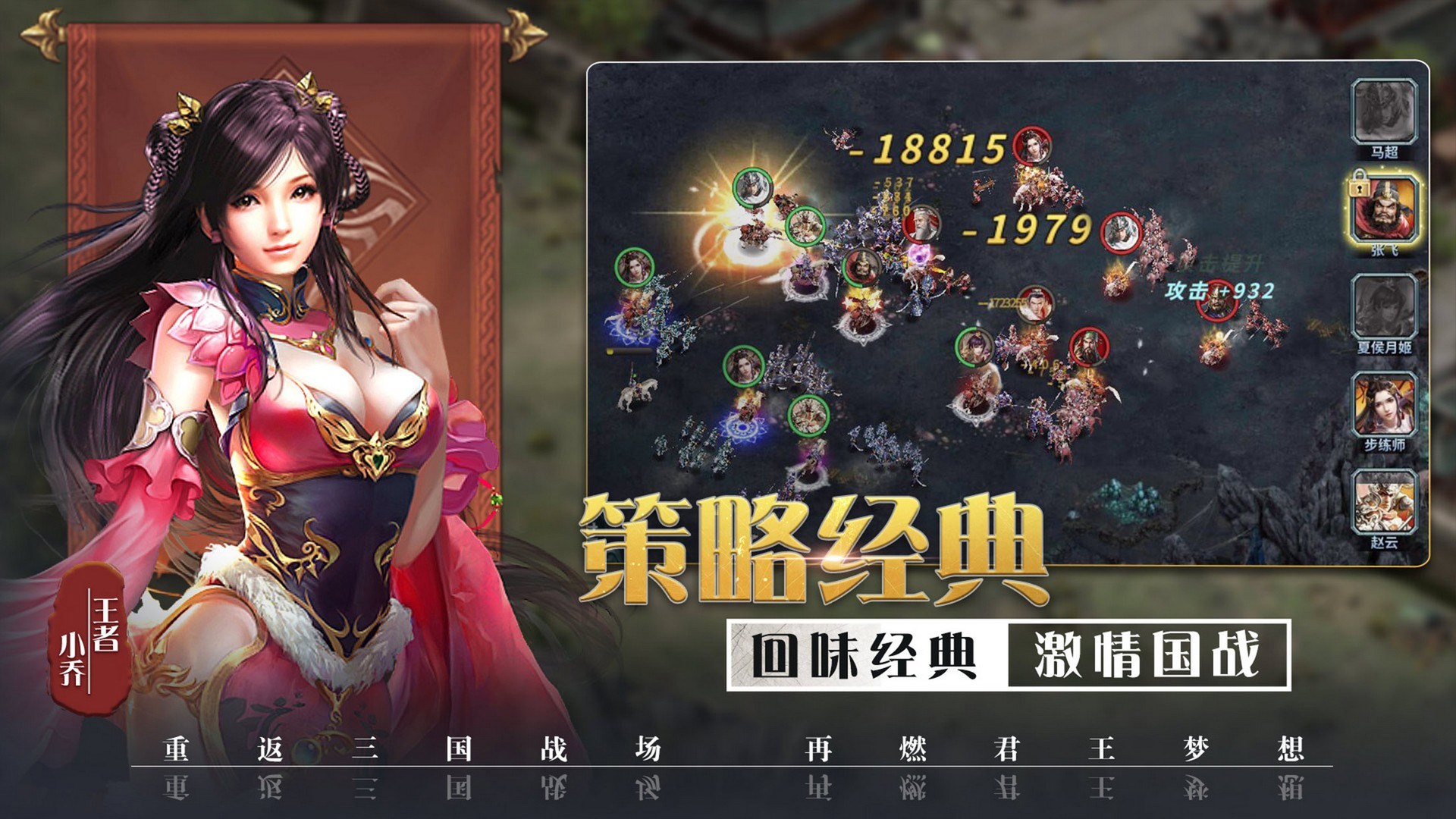 彙集三國史實數百武將,囊括大量謀臣英雄美人,戰神呂布,卧龍諸葛亮,常山趙子龍,武聖關羽,魏王曹操,以及貂蟬,大小喬等等,名將雲集,爭霸三國。