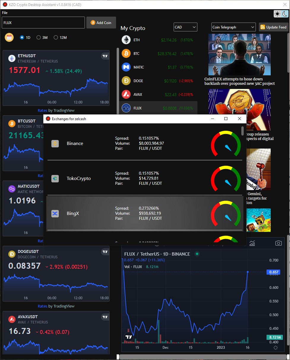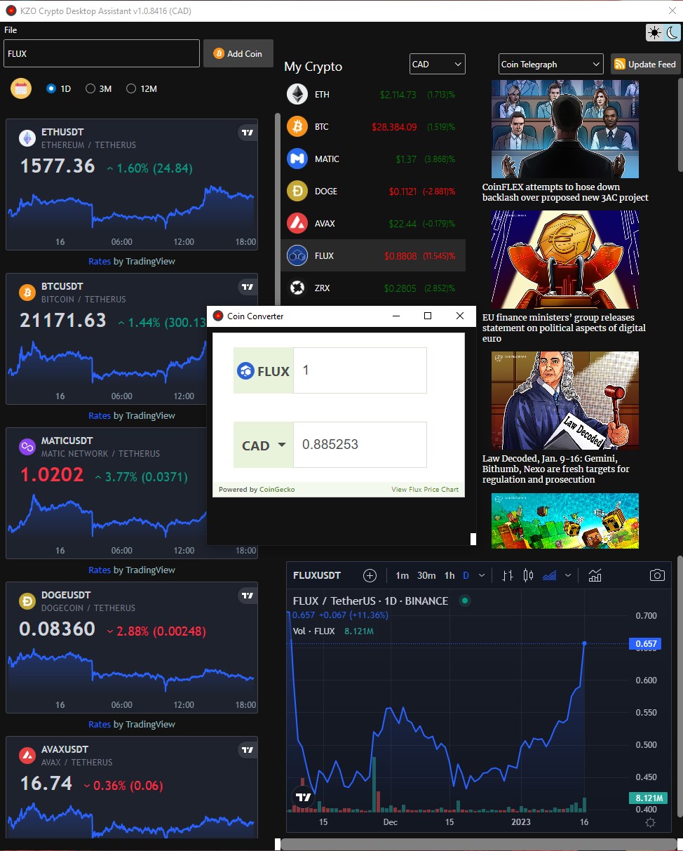 The KZO Crypto Desktop assistant is a simple tool to monitor and assess cryptocurrency prices. An effort was made to use as little screen real-estate as possible with an attempt to present a maximum amount of information. A continously refreshed news feed allows the user to keep up to date on all current crypto events, while the highly customizable chart widgets allow the user to make decisions based on that data. All widgets are powered by Trade View. Crypto price and symbol data is a hybrid mix provided by Binance and Coingecko.