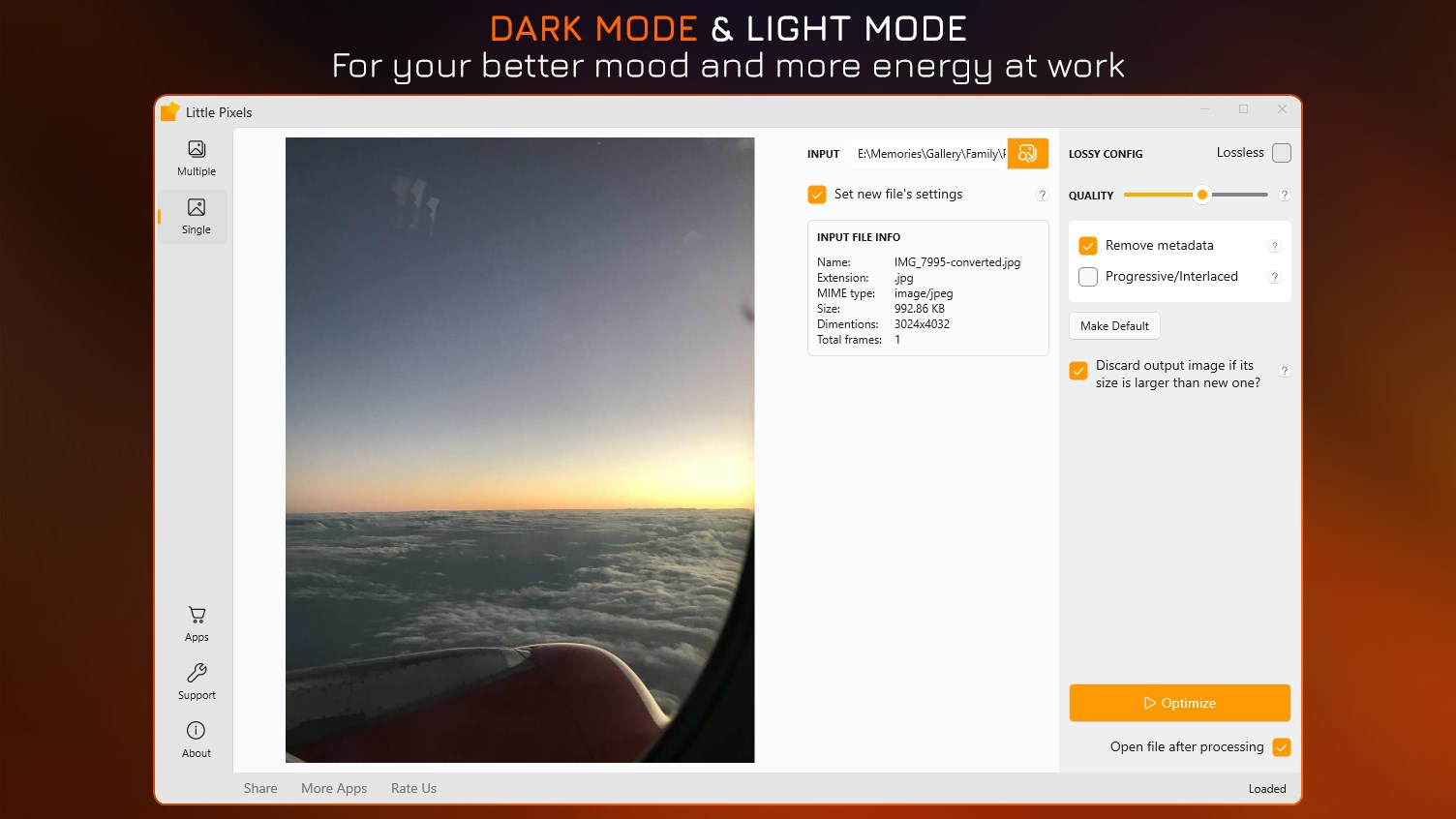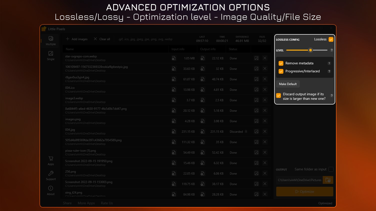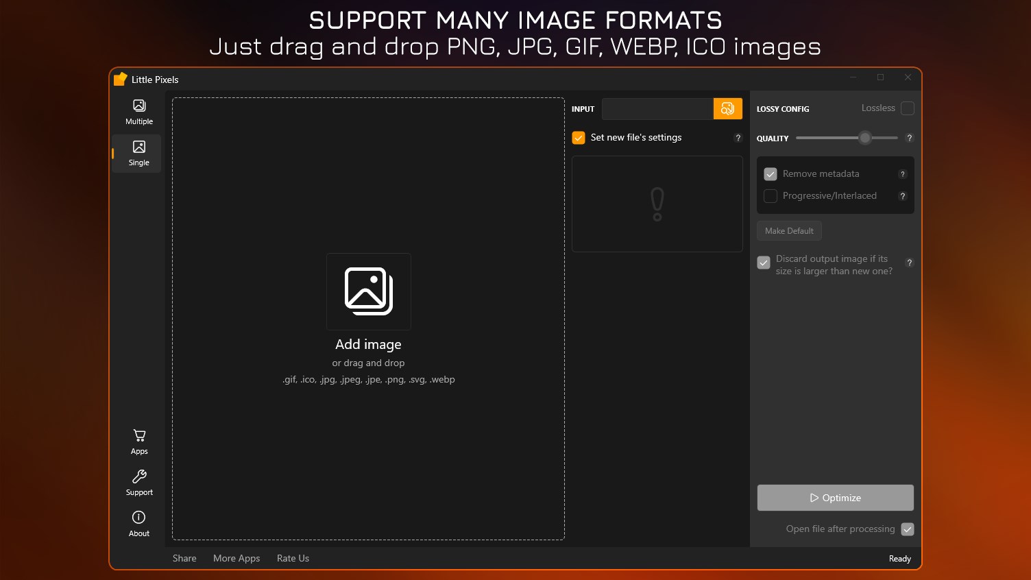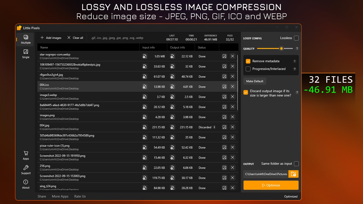 Compress PNG, JPG, GIF, ICO, SVG, WEBP to reduce file size with lossless or lossy method.