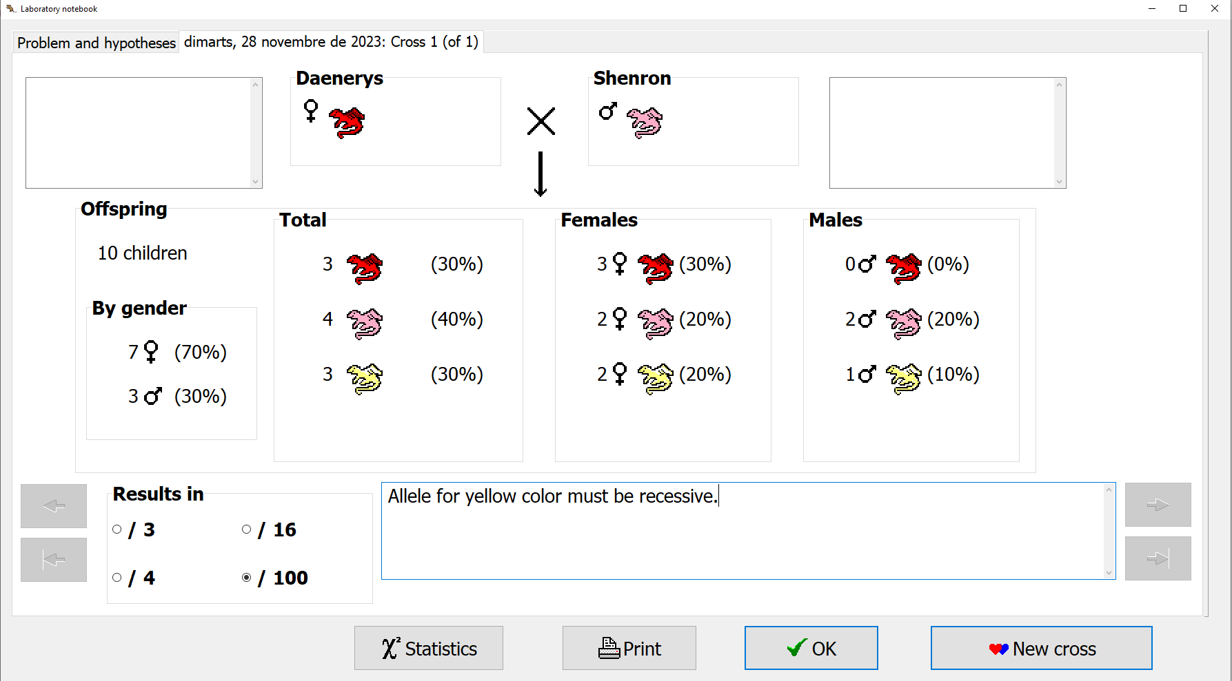 -Investigations. Imaginary animals (dragons) can have three phenotypes for a character. We will have to find out if it is intermediate inheritance, three alleles with dominance, simple dominant epistasis or simple recessive epistasis. The inheritance pattern is randomly decided every time we start the problem. These are really difficult problems, at the level of research for high school or university students, which will require a written report to be submitted to the teacher.