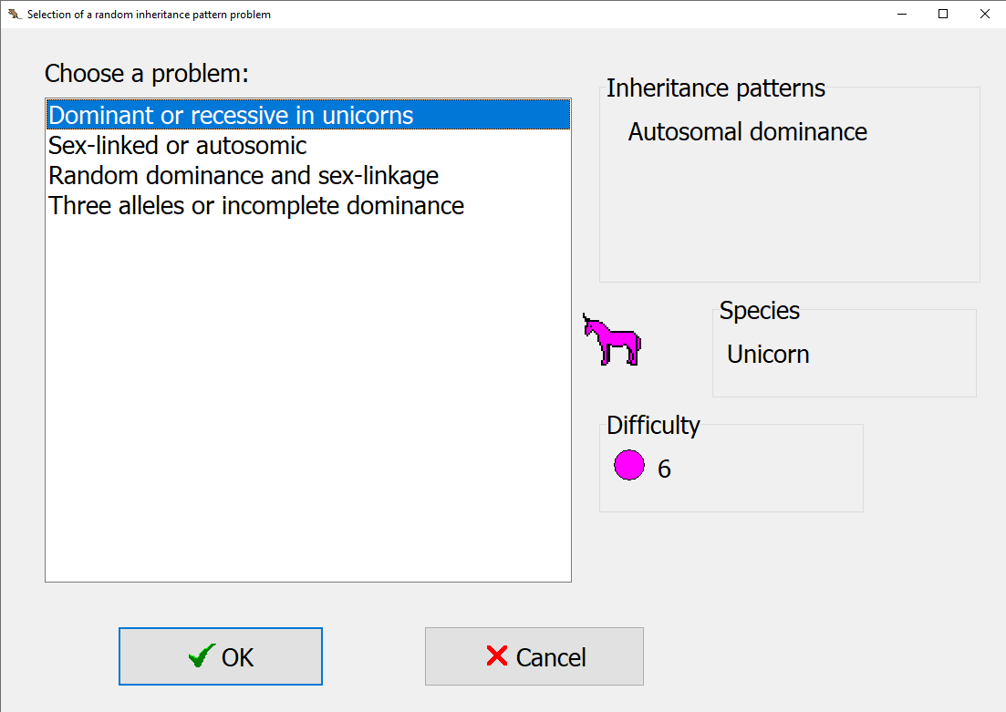 -Random inheritance pattern problems. As above, but we will be working with imaginary animals (unicorns) and the details of the inheritance pattern will be decided randomly each time we start the problem.