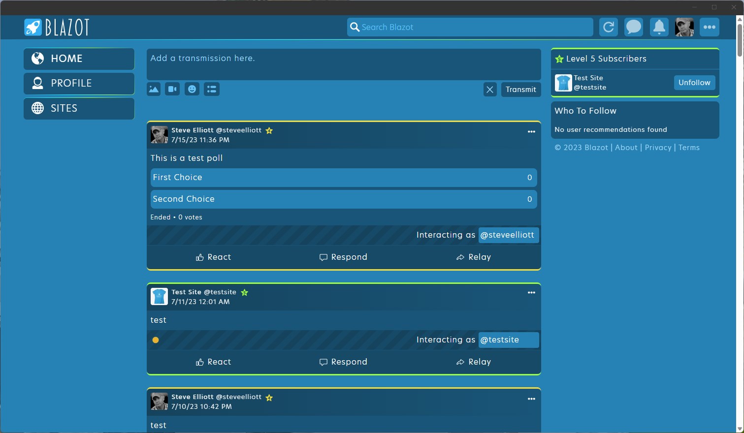 Send transmissionsRespond to transmissionsRelay transmissionsRelay transmissions with a commentAdd a poll to a transmissionAdd images or a video to a transmissionCreate a "Site" for your business or organization.Add hashtags and mention users or "Sites" in your transmission