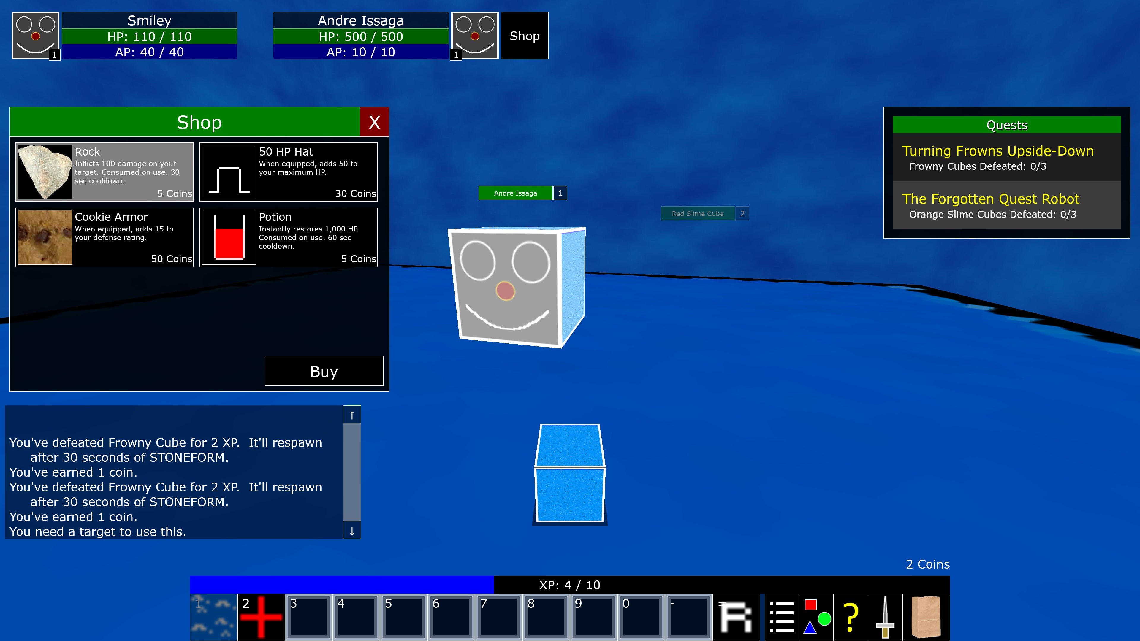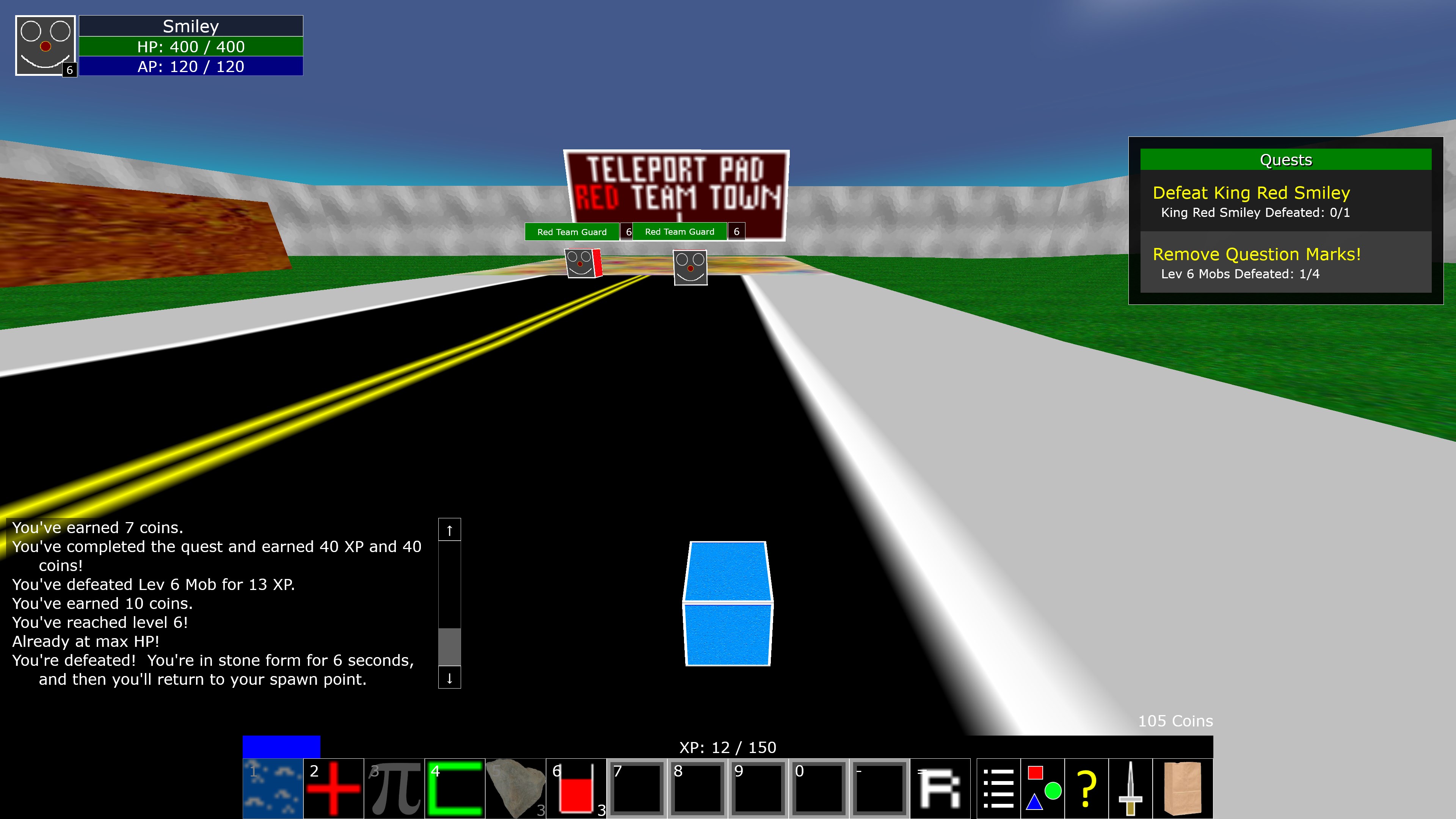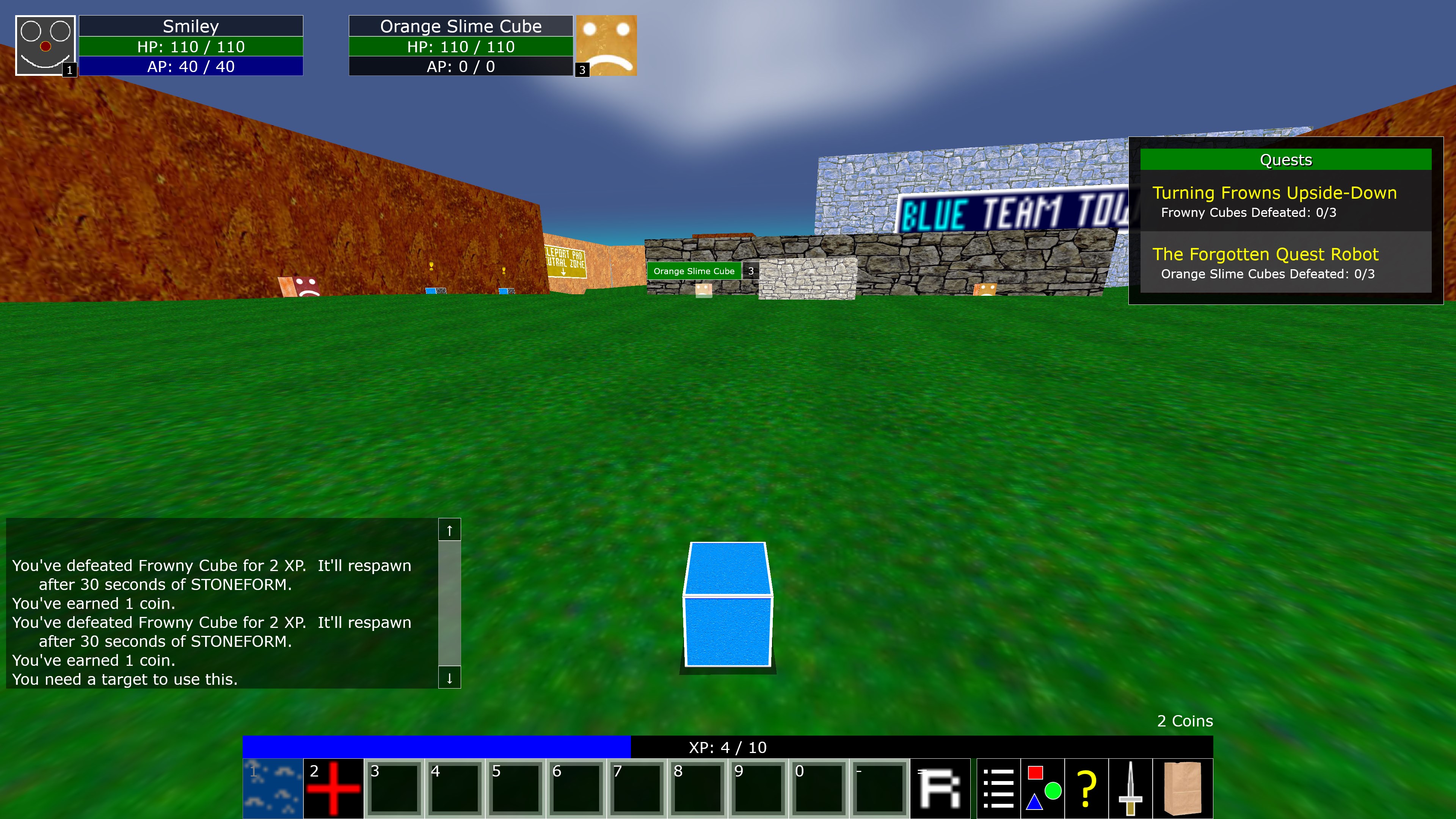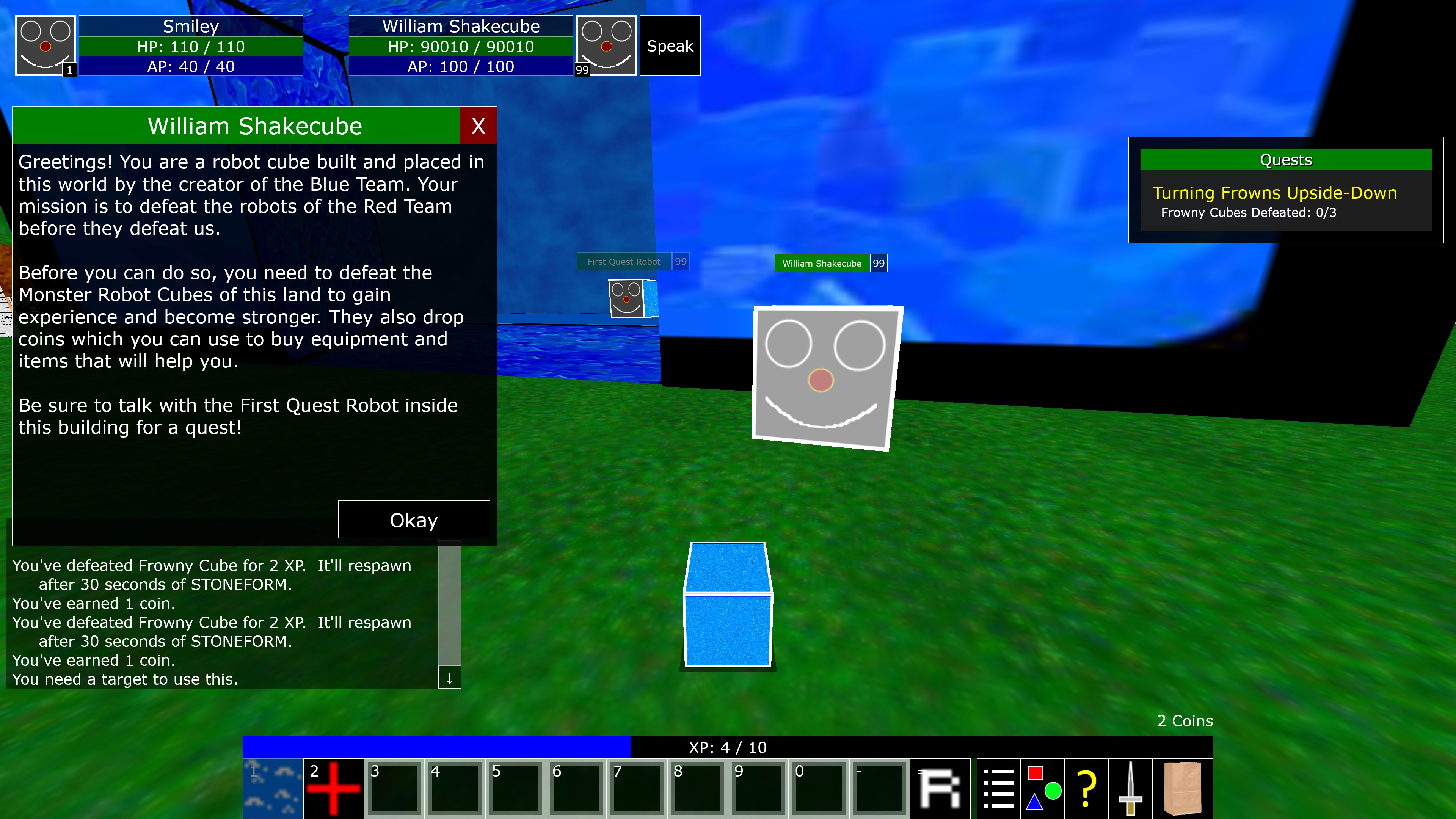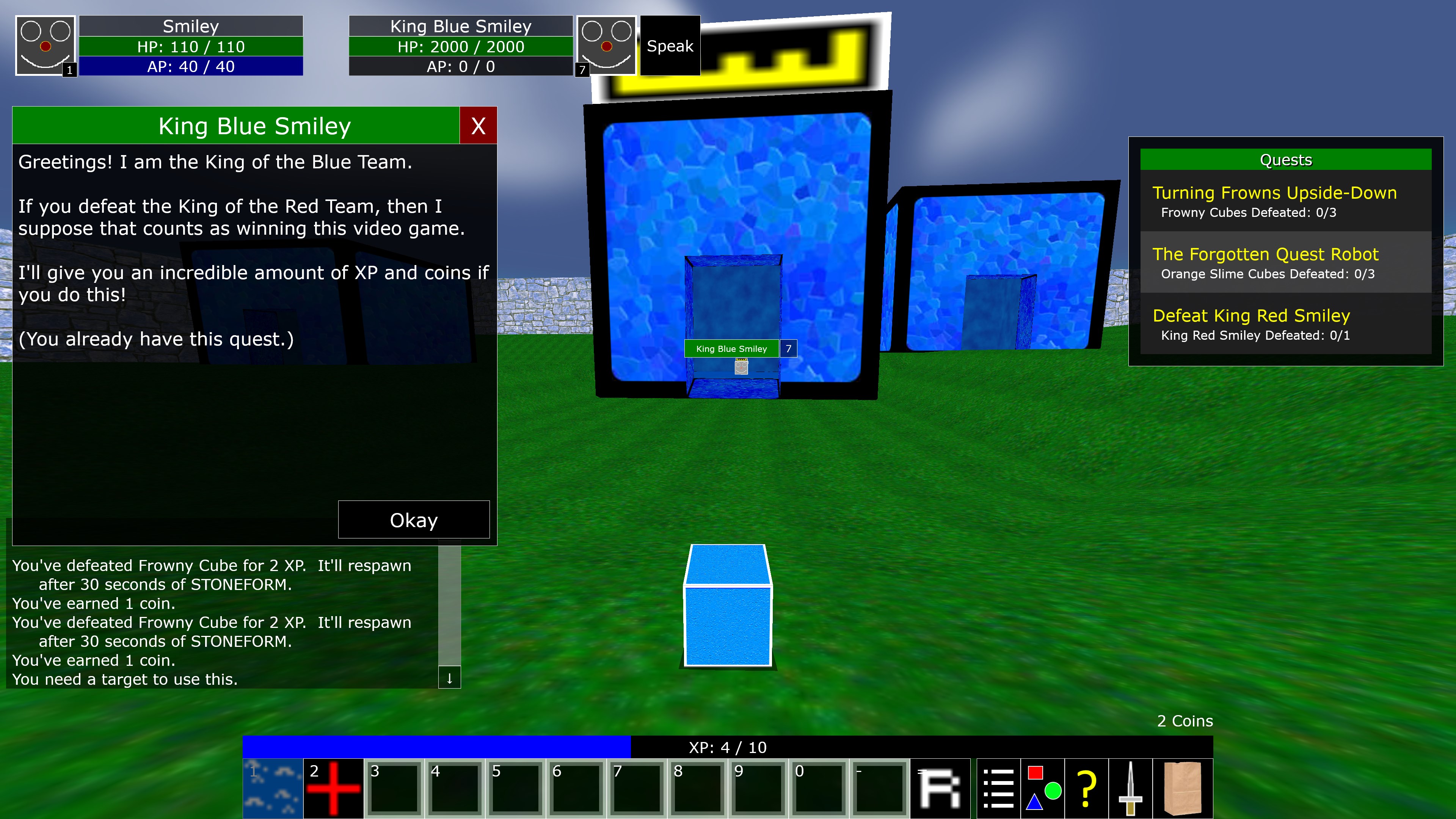 Zancrunio is a MMORPG (Massively Multiplayer Online Role Playing Game). It also has an offline mode. Set in the Land of Zancrunio, you control a robotic cube with a smiley face on it, known as a SmileyCube. Choose whether you're on the Blue Team or the Red Team. Fight and defeat MonsterCubes to gain enough experience and strength to eventually defeat the king of the other team! (Oh BTW, the kings are also robotic cubes. In fact, ALL of the characters in this game are robotic cubes! ALL OF THEM! No living beings are depicted in this game.)