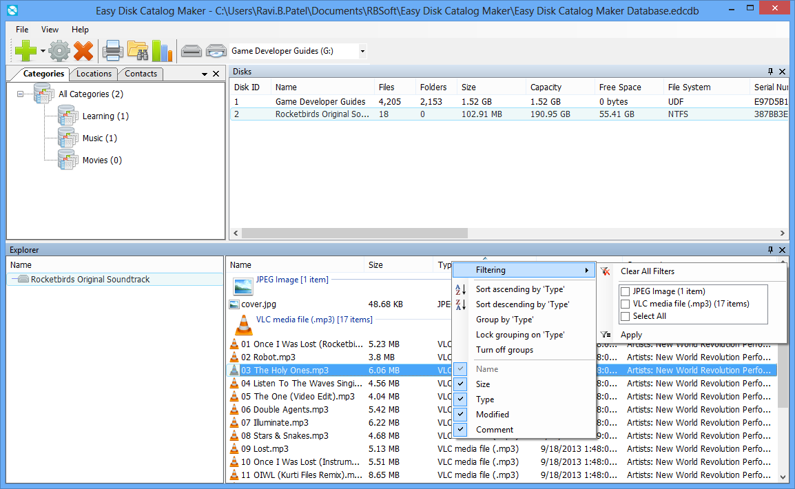 Easy Disk Catalog Maker is the fastest application for cataloging and indexing files, stored on your disks (e.g. Hard Drives, DVDs, Blu-rays, Network drives etc.). It helps you find a file you are looking for in seconds without even connecting all those disks to the PC. Easy Disk Catalog Maker brings simplicity in file management, so you can get more work done in less time, whether you are a normal PC user or belong to a large enterprise.
