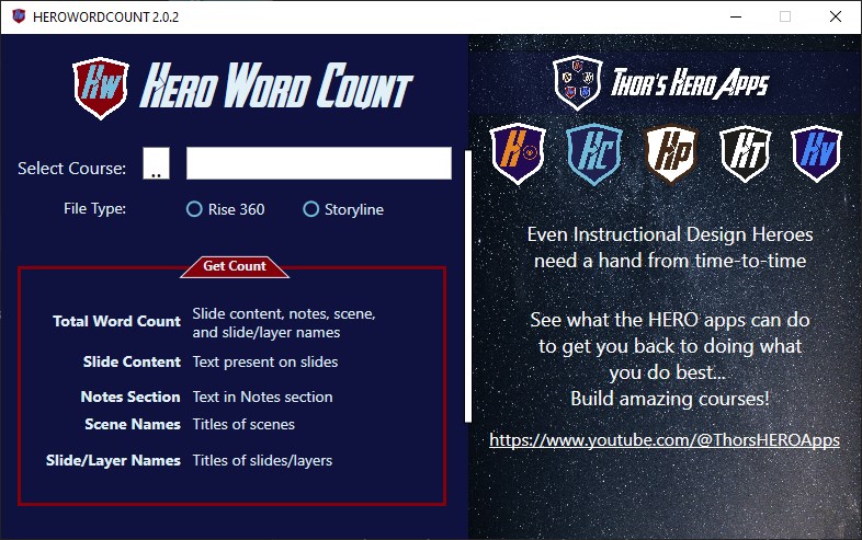 This free application determines how many words are in your Articulate Rise 360 or Storyline 3 / 360 course.